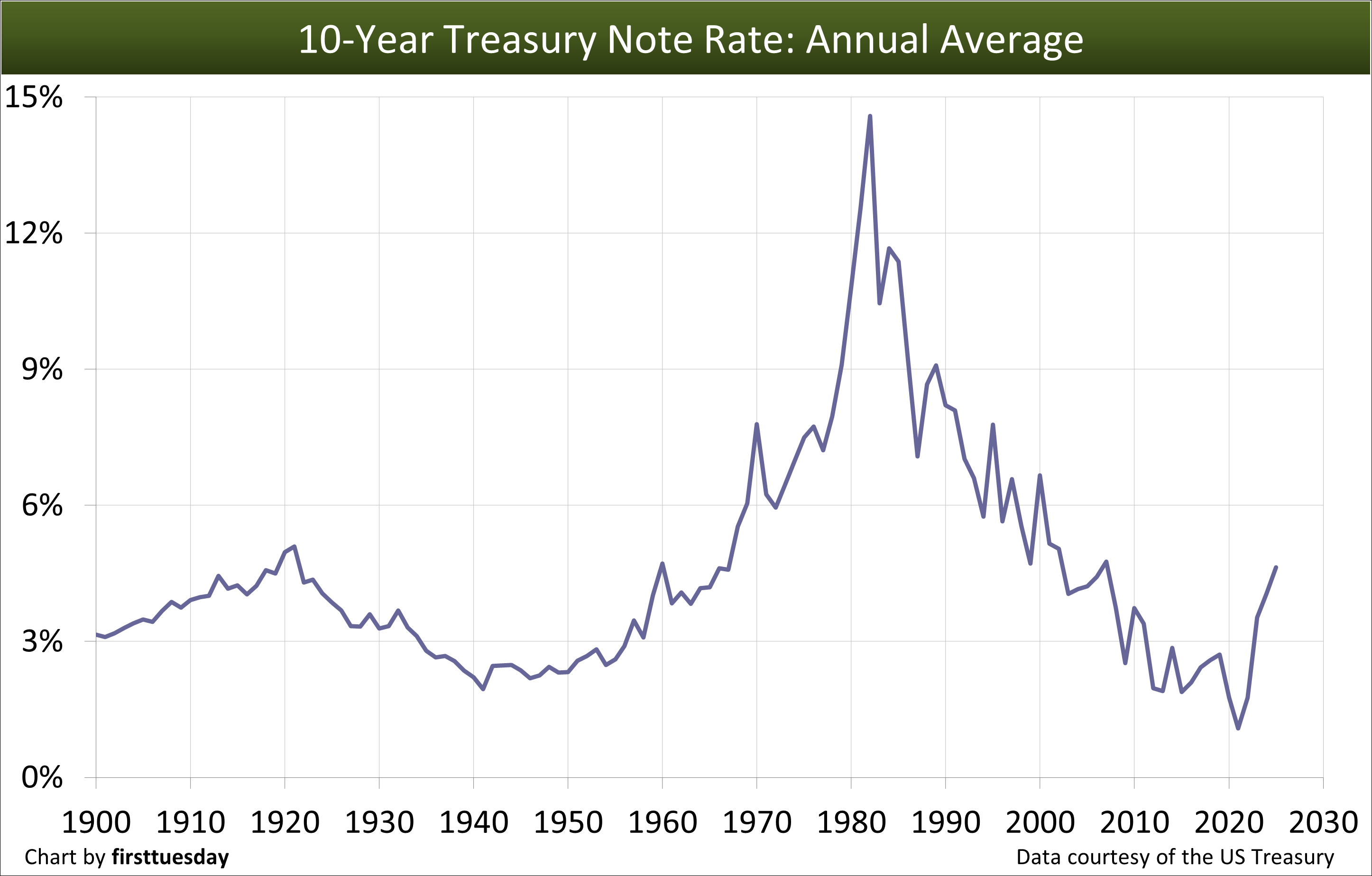 The 10-year Treasury note held at 4.11% the week of October 3, 2025. A steady pace of decline in the 10-year T-Note rate took place in 2025 beginning at 4.63%. The 10-year T-Note rate averaged an anomalous rock-bottom 0.89% during the 2020-2021 pandemic period as the T-Note became the ultimate safe haven until investment opportunities returned.