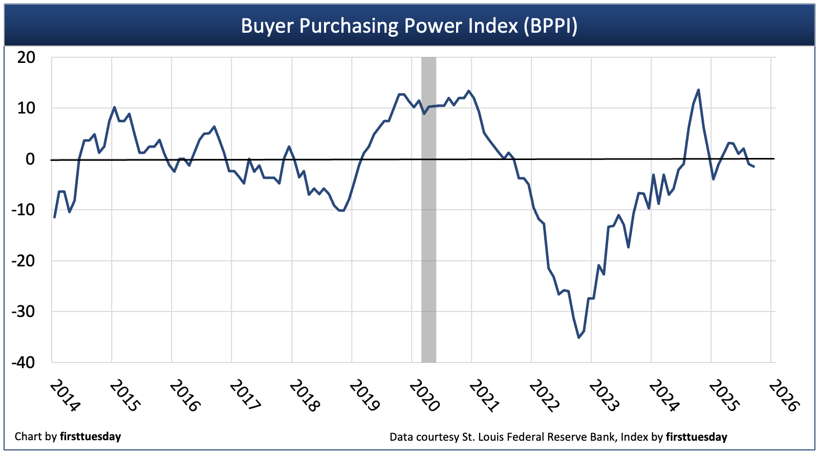 The California Buyer Purchasing Power Index (BPPI) figure is negative, at -1.47 in the third quarter (Q3) of 2025. This figure tells us a homebuyer with the same income is able to borrow 1.47% less purchase-assist mortgage money than a year ago, plus the COLA (or cost of living adjustment) percentage of wage increases.