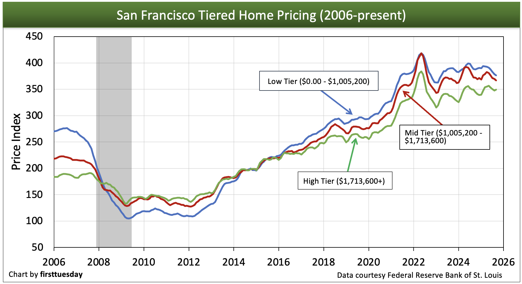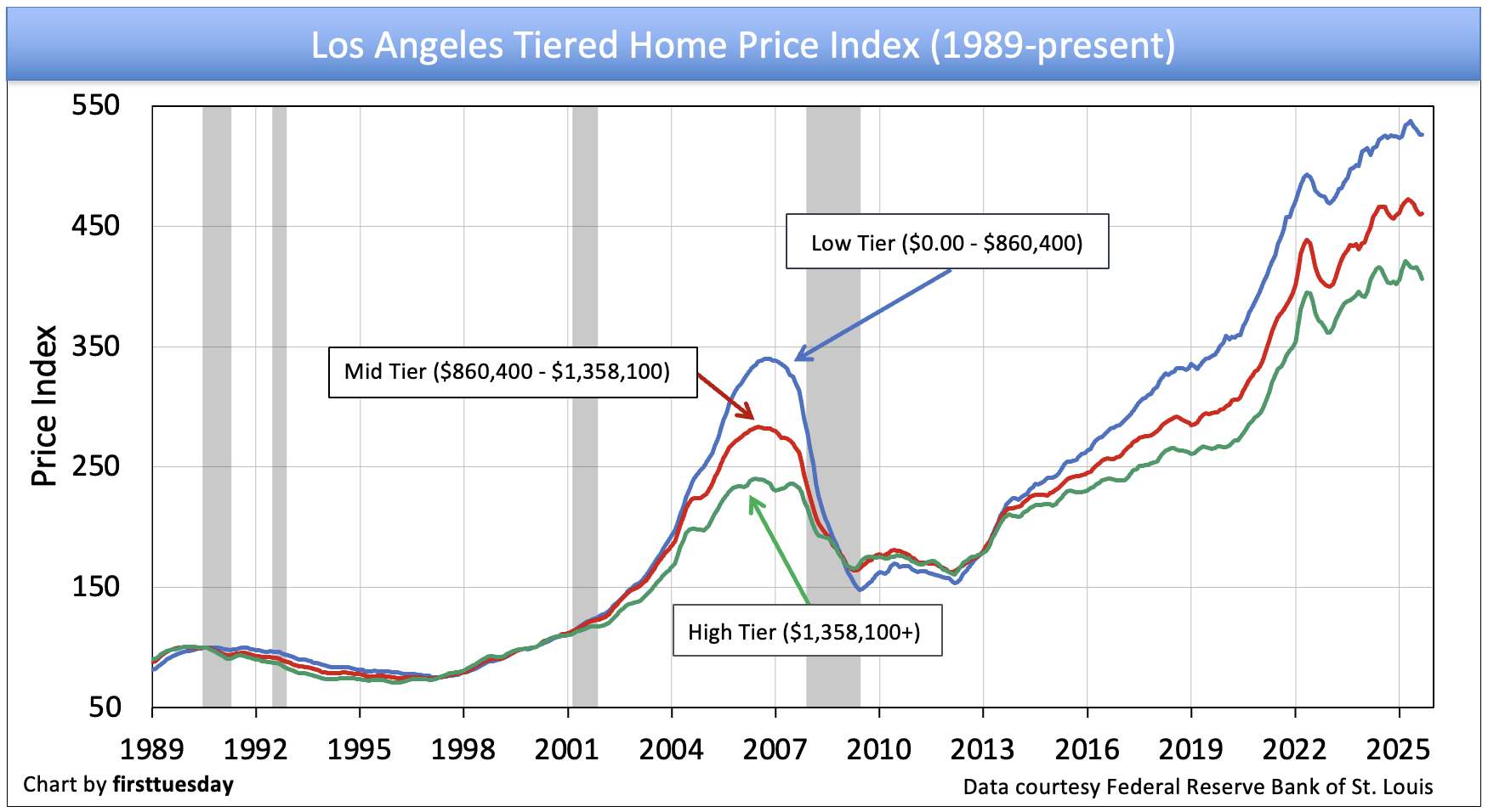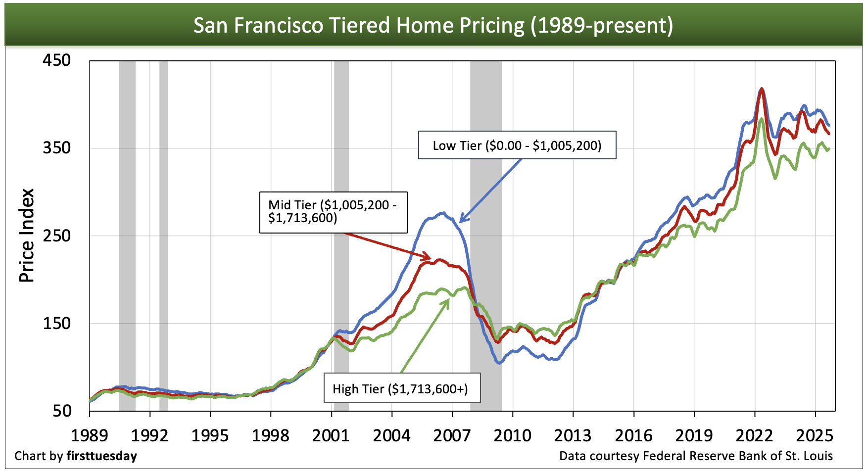 While prices for low-tier properties are most volatile, generally changing quickly and dramatically as depicted in the charts above, high-end properties are slower to react to the rise and fall of the market. Different tiers often move in opposite directions at the same time, and when upward or downward price movement occurs, each tier experiences a different percentage of price change.