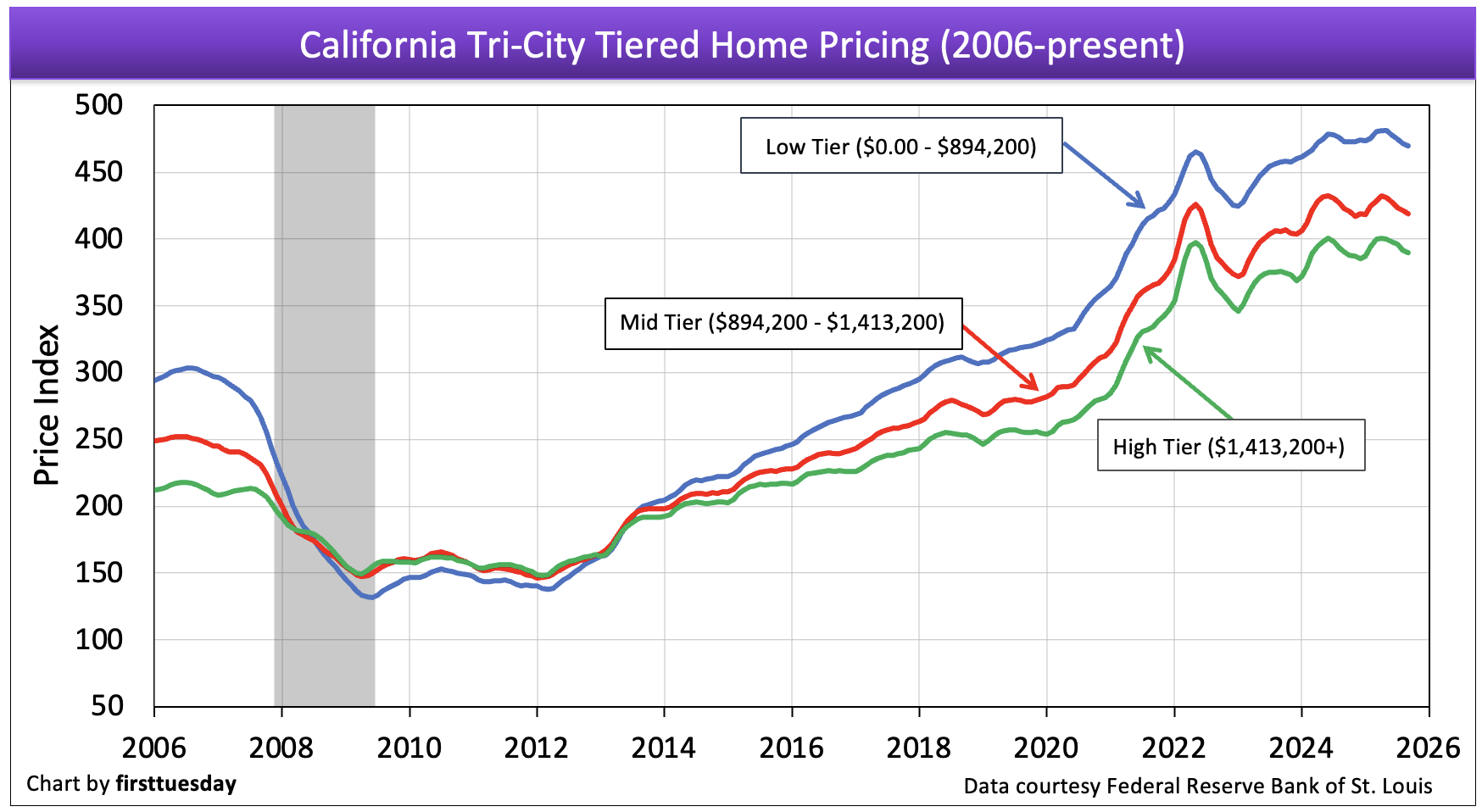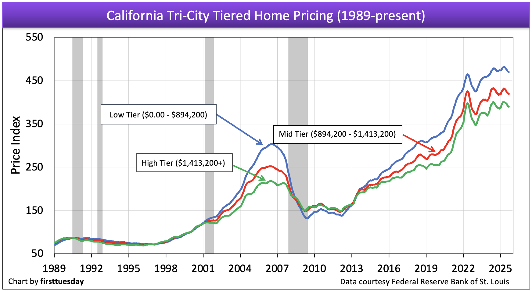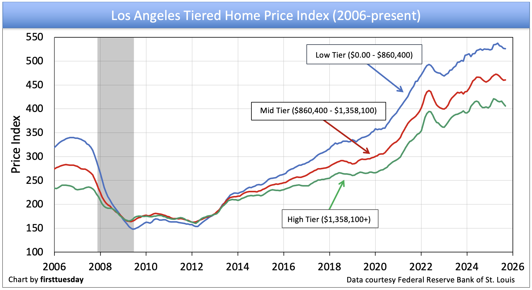 While prices for low-tier properties are most volatile, generally changing quickly and dramatically as depicted in the charts above, high-end properties are slower to react to the rise and fall of the market. Different tiers often move in opposite directions at the same time, and when upward or downward price movement occurs, each tier experiences a different percentage of price change.