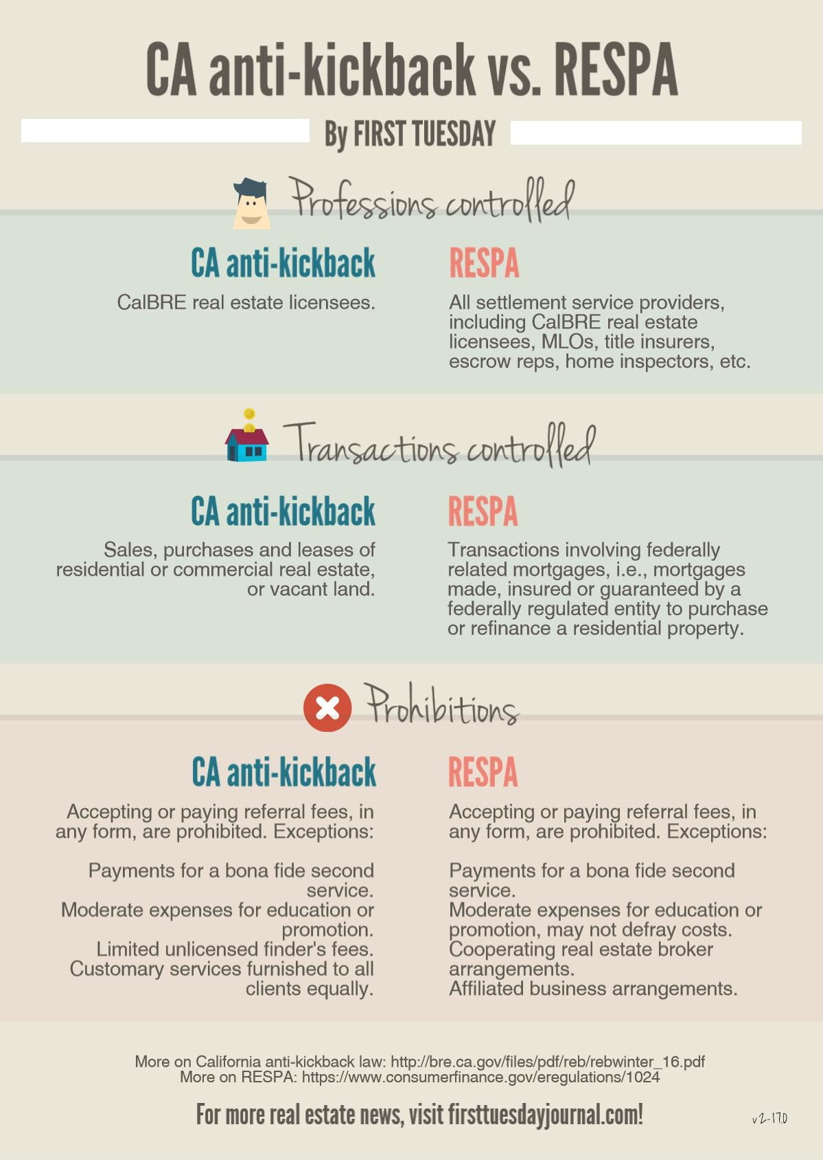 Anti-kickback vs. RESPACA anti-kickback vs. RESPAInfographicsCalifornia law, kickbacks, referral fees, mortgages, real estate agents, real estate brokers, Real Estate Settlement Procedures Act (RESPA)2/15/2017