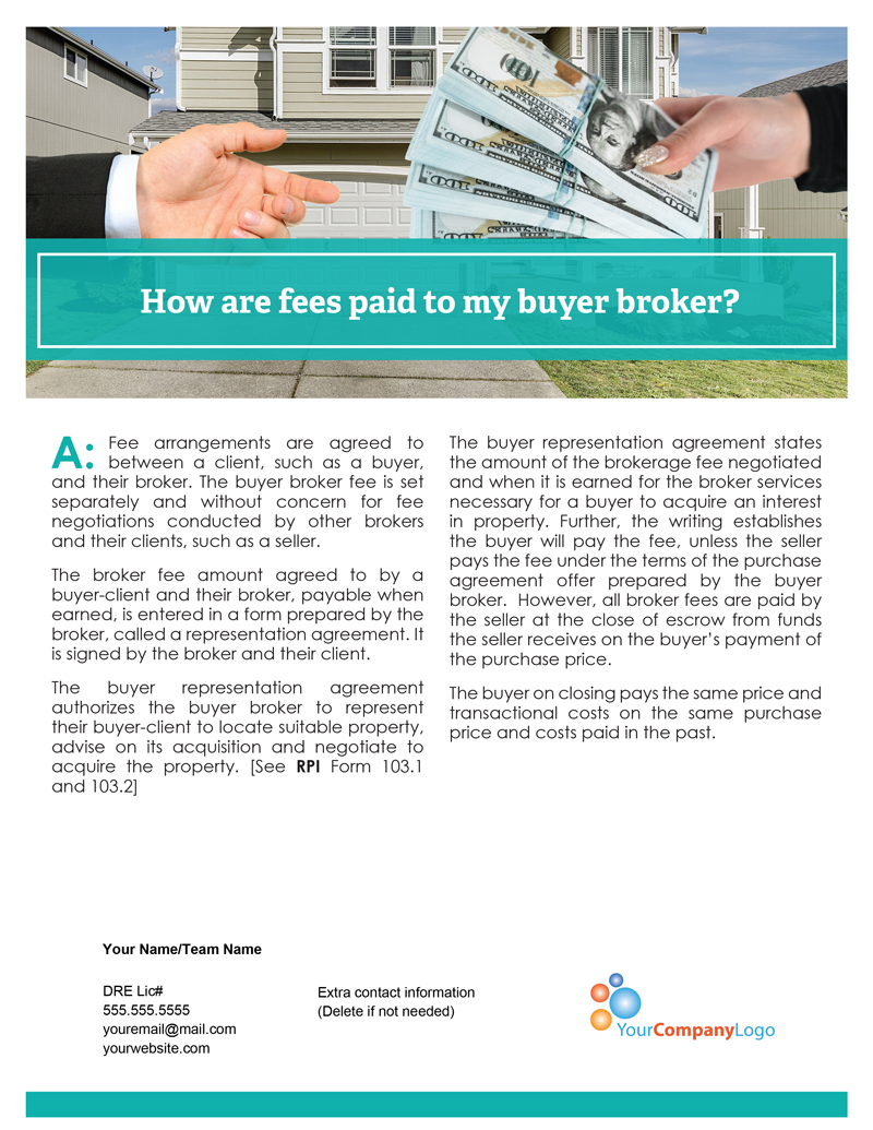 The broker fee amount agreed to by a buyer-client and their broker, payable when earned, is entered in a form prepared by the broker, called a representation agreement. It is signed by the broker and their client.