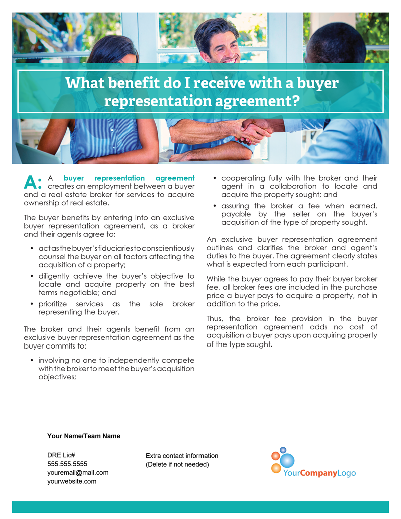 An exclusive buyer representation agreement outlines and clarifies the broker and agent’s duties to the buyer. The agreement clearly states what is expected from each participant.