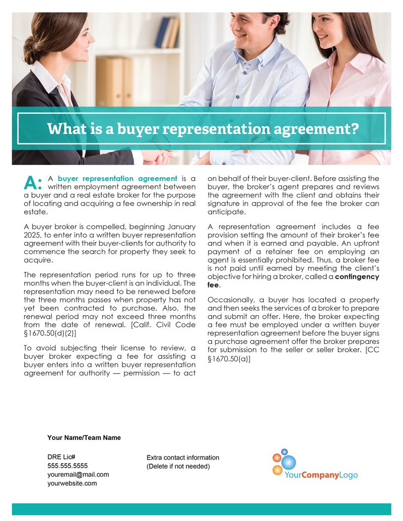 A buyer broker is compelled, beginning January 2025, to enter into a written buyer representation agreement with their buyer-clients for authority to commence the search for property they seek to acquire.