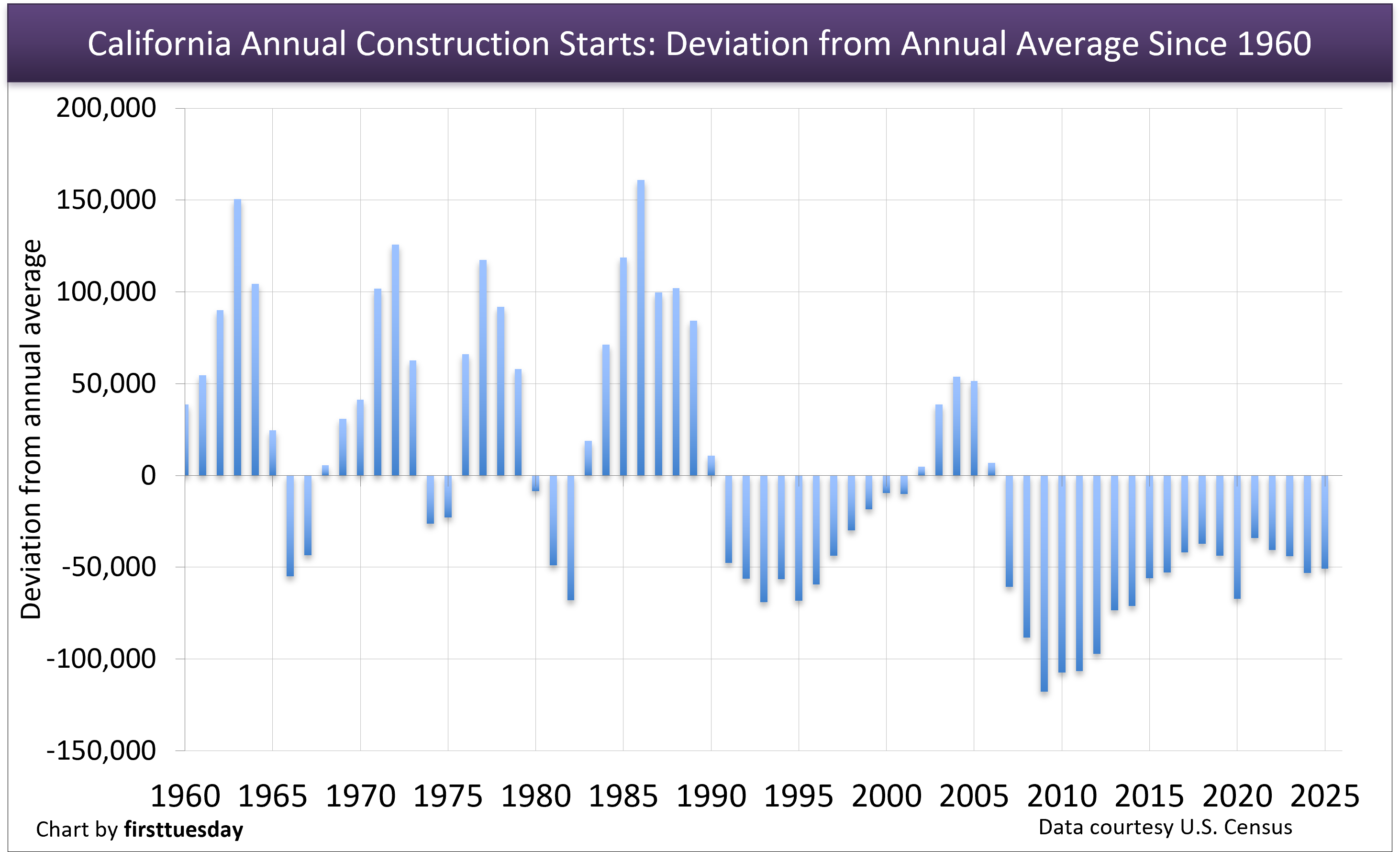 The bars in the chart above indicate the deviation from the average annual construction of housing units in California (the left axis). The line that follows the bars corresponds with the actual number of construction starts completed each year (the right axis).