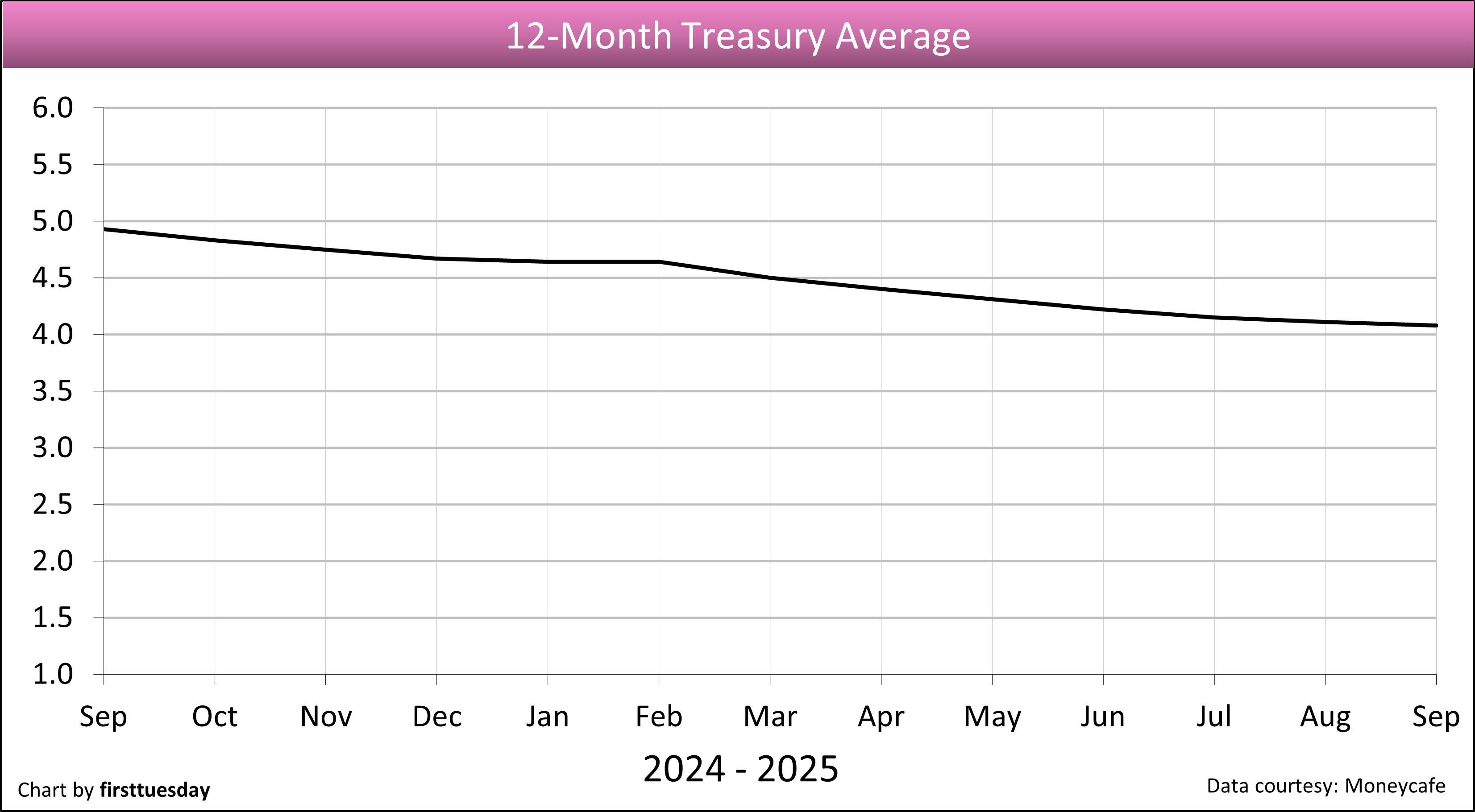 This index is one of several indices used by lenders as stated in their ARM note to periodically adjust the note’s interest rate. This figure is an average of the one-year T-Bill rates for the past 12 months. The ARM interest rate equals the 12-Month Treasury Average yield plus the lender’s profit margin. There is a one-to-two month lag in data reporting for the 12-Month Treasury Average. | ||