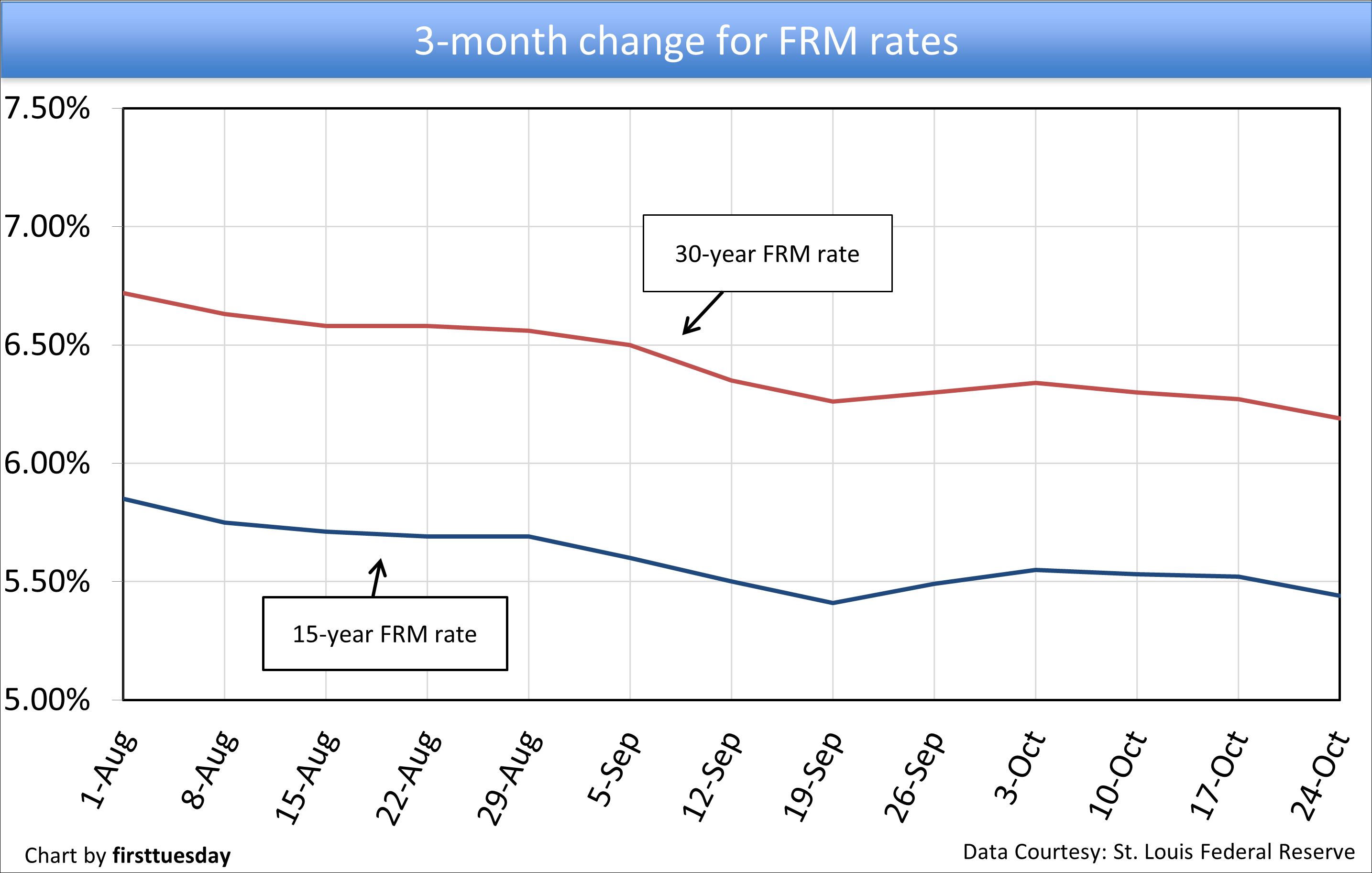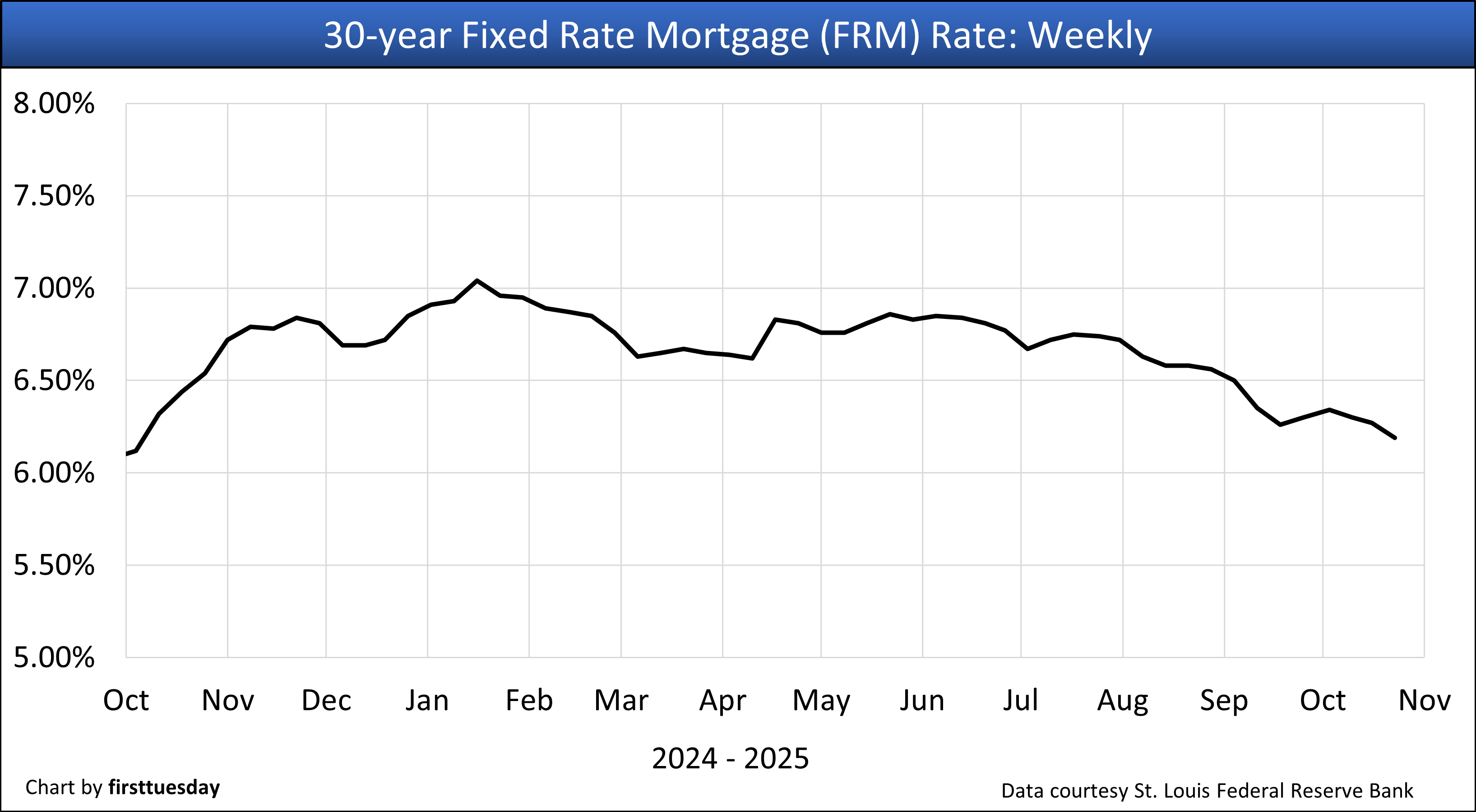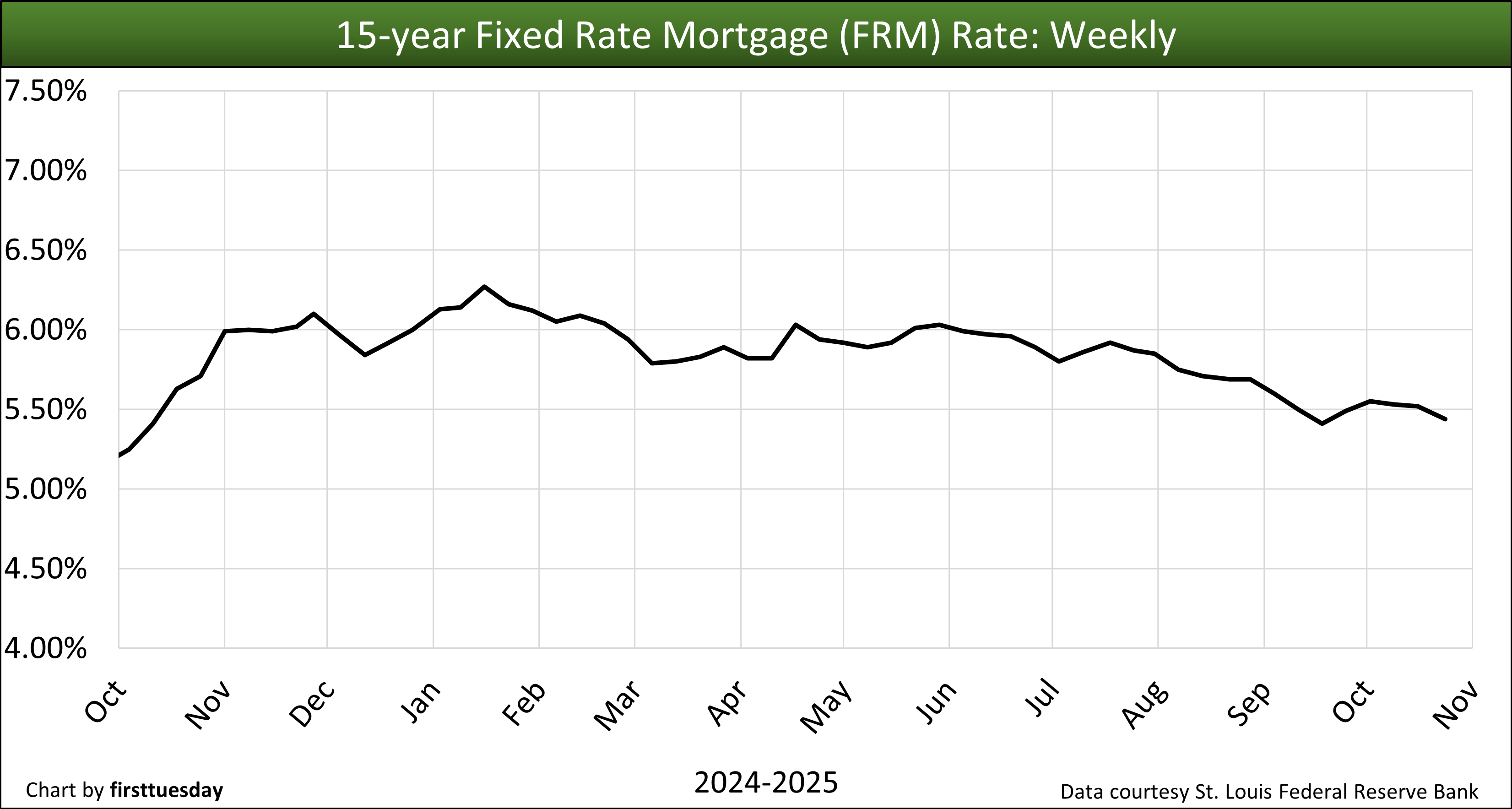 The rate on an average 30-year fixed rate mortgage (FRM) declined to 6.19% in the week ending October 24, 2025. The average 15-year FRM dropped to 5.44%. For those able to switch, the 15-year FRM is one-eighth less expensive than the 30-year FRM — though principal is more quickly amortized in larger monthly payments.