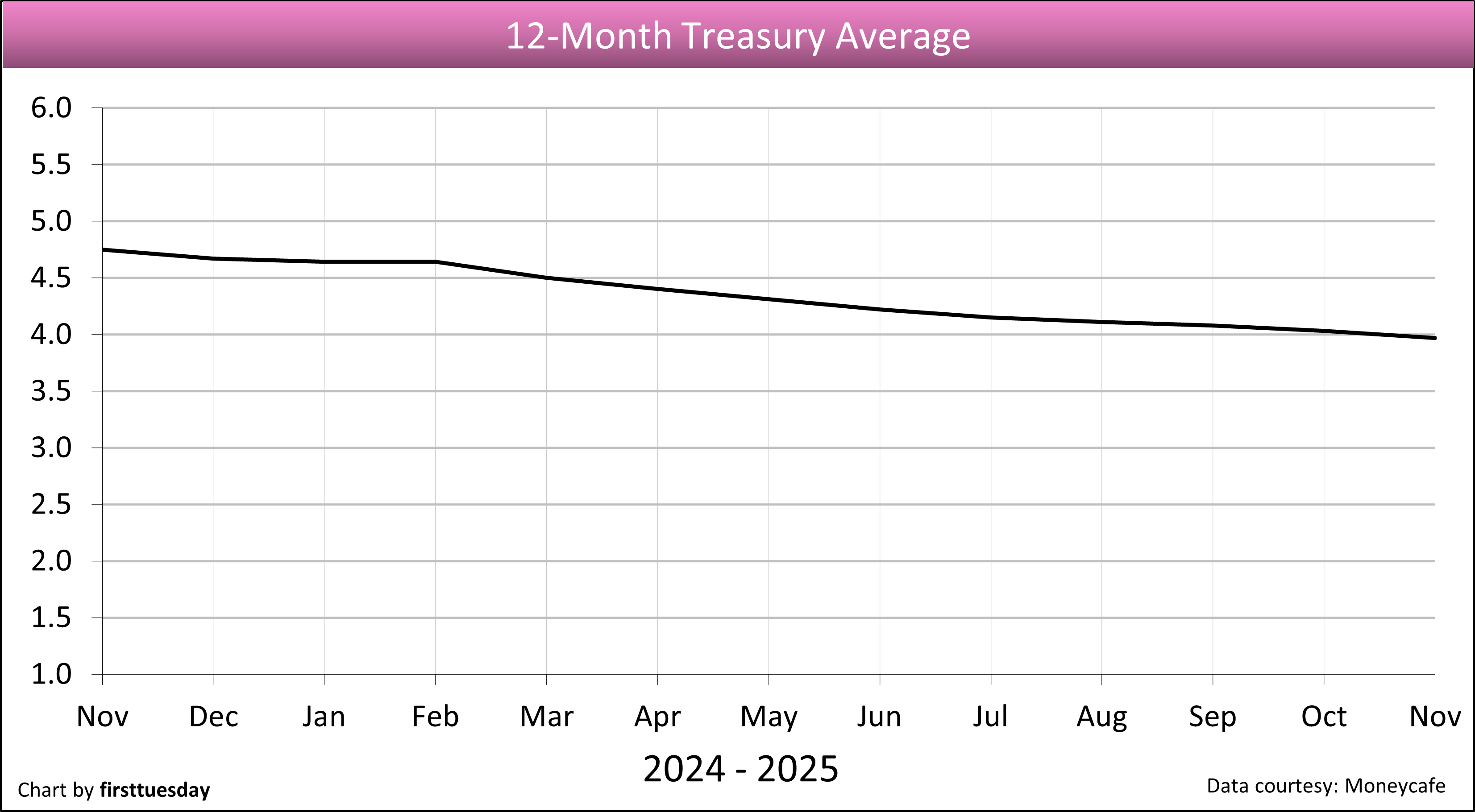 This index is one of several indices used by lenders as stated in their ARM note to periodically adjust the note’s interest rate. This figure is an average of the one-year T-Bill rates for the past 12 months. The ARM interest rate equals the 12-Month Treasury Average yield plus the lender’s profit margin. There is a one-to-two month lag in data reporting for the 12-Month Treasury Average. | ||