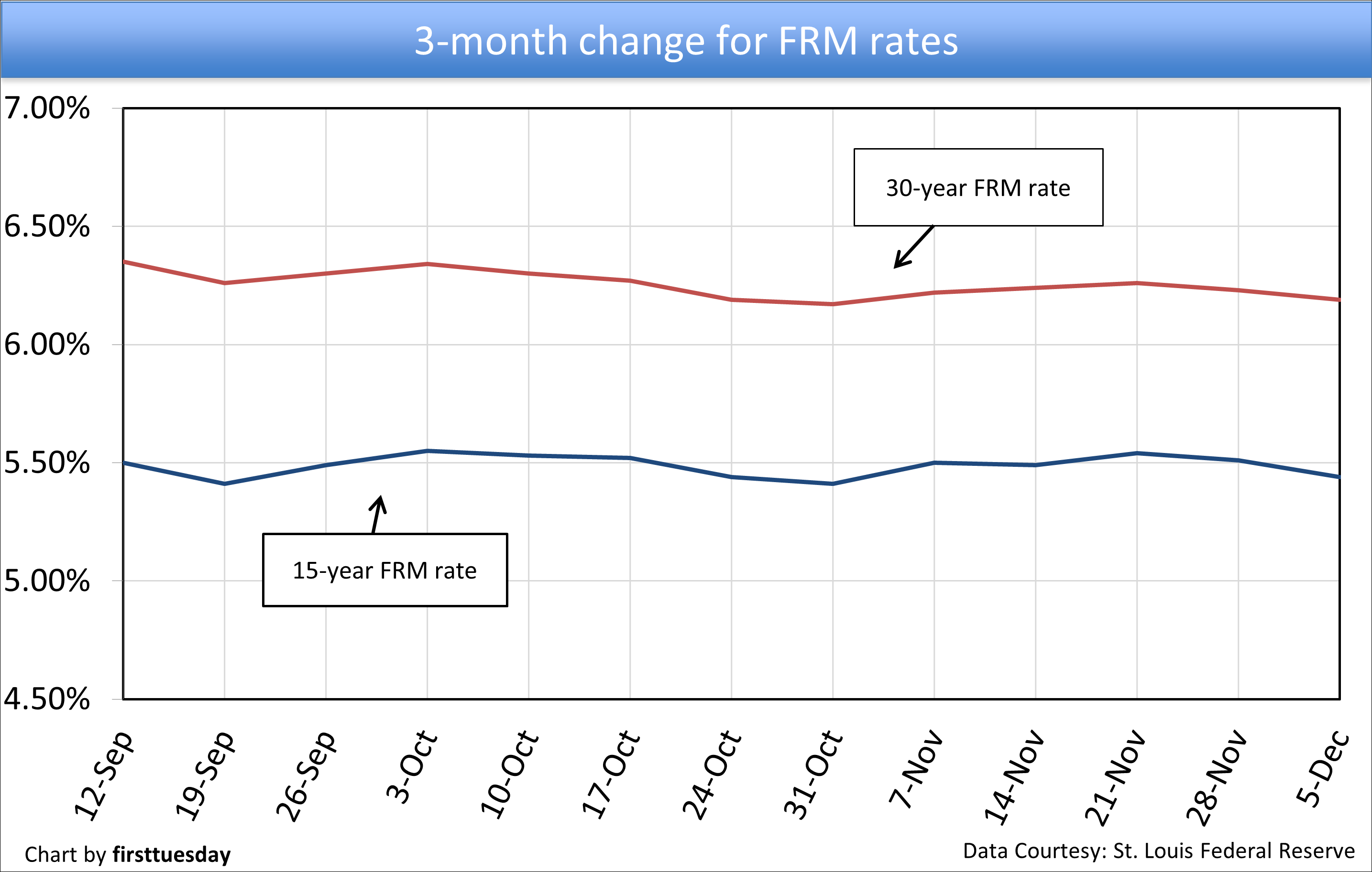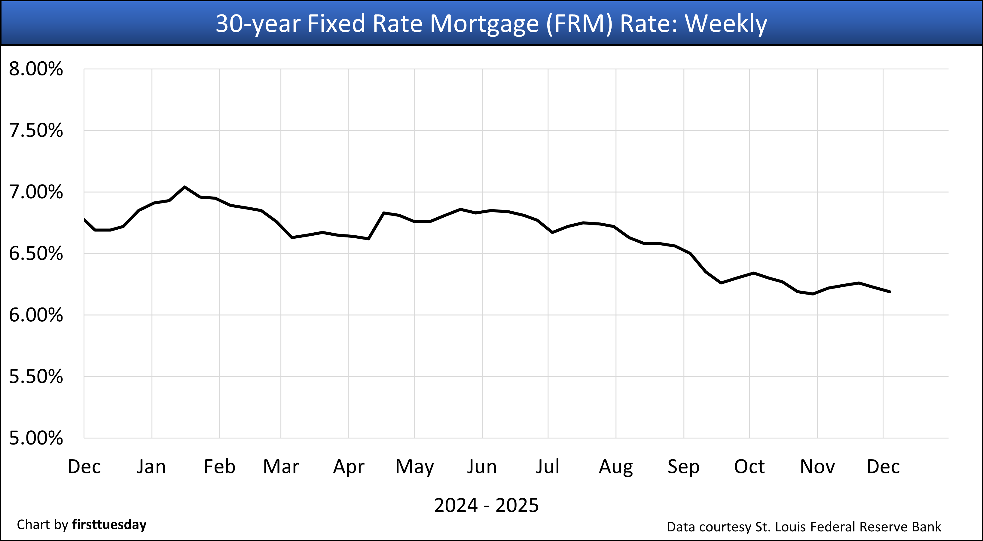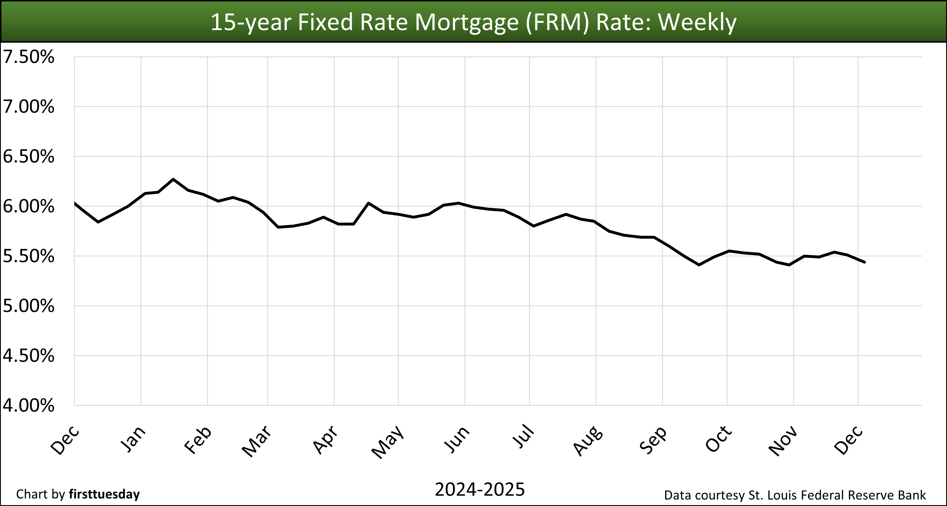 The rate on an average 30-year fixed rate mortgage (FRM) slid to 6.19% in the week ending December 5, 2025. The average 15-year FRM deflated to 5.44%. For those able to switch, the 15-year FRM is one-eighth less expensive than the 30-year FRM — though principal is more quickly amortized in larger monthly payments.