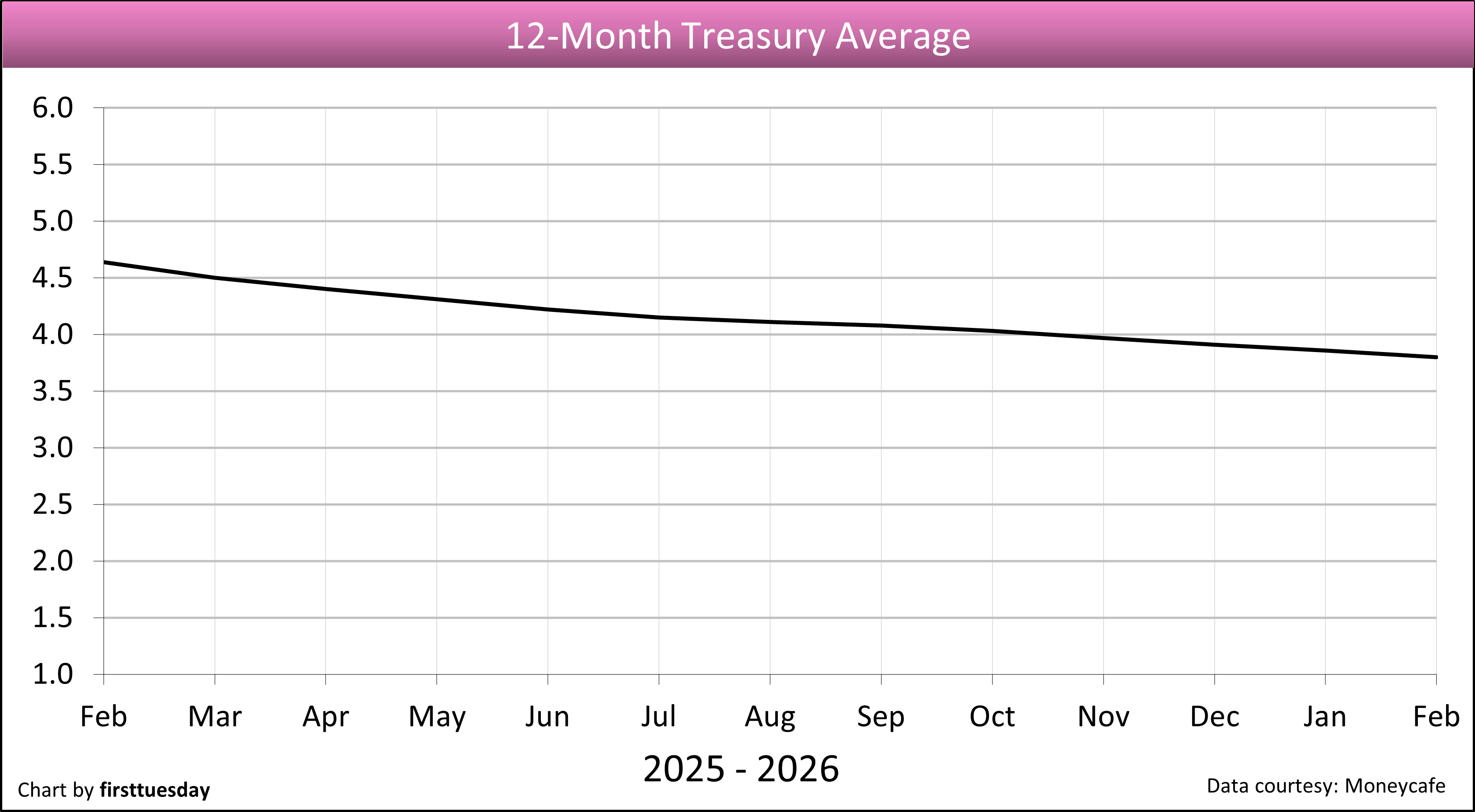 This index is one of several indices used by lenders as stated in their ARM note to periodically adjust the note’s interest rate. This figure is an average of the one-year T-Bill rates for the past 12 months. The ARM interest rate equals the 12-Month Treasury Average yield plus the lender’s profit margin. There is a one-to-two month lag in data reporting for the 12-Month Treasury Average. | ||