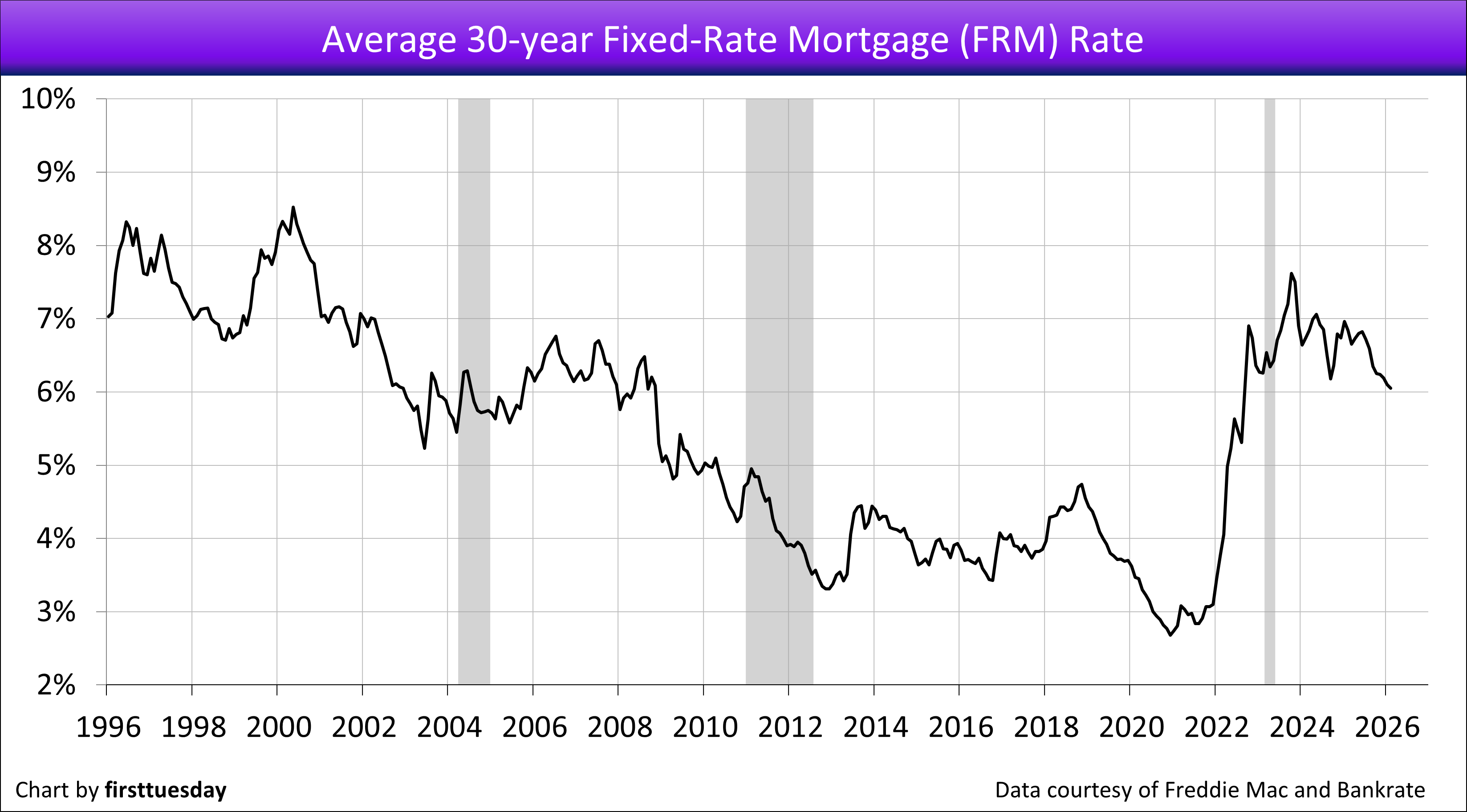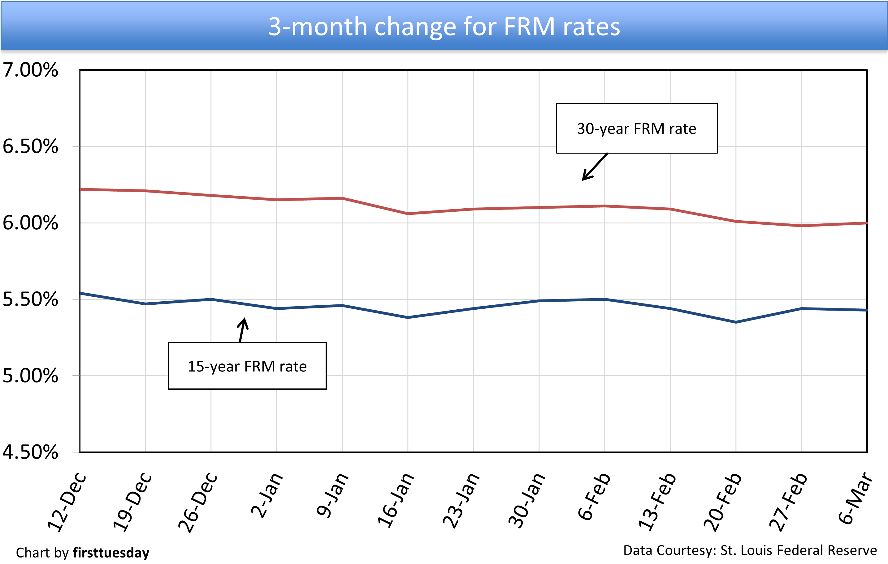 The rate on an average 30-year fixed rate mortgage (FRM) inched up to 6.00% in the week ending March 6, 2026. The average 15-year FRM dipped to 5.43%. For those able to switch, the 15-year FRM is one-eleventh less expensive than the 30-year FRM — though principal is more quickly amortized in larger monthly payments.