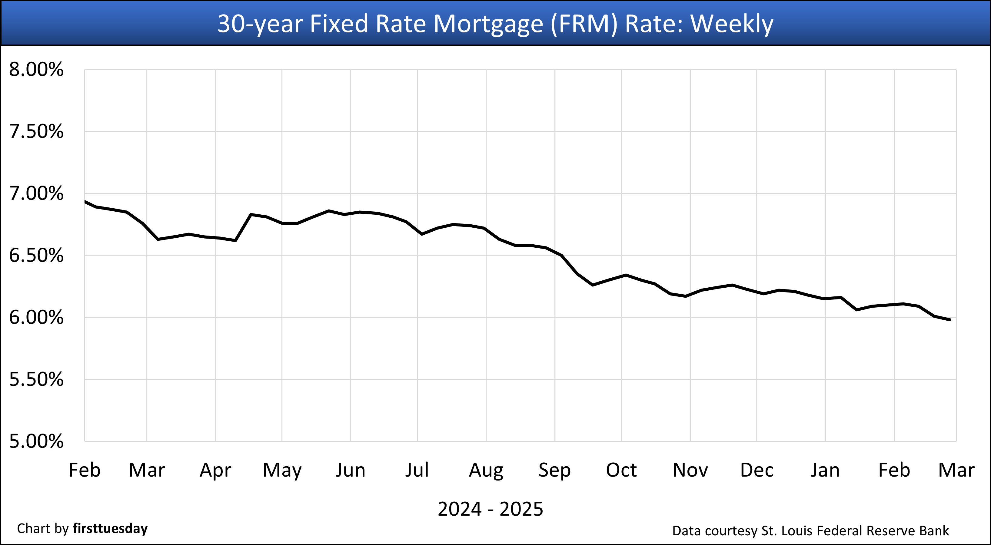The rate on an average 30-year fixed rate mortgage (FRM) decreased to 5.98% in the week ending February 26, 2026. The average 15-year FRM crept up to 5.44%. For those able to switch, the 15-year FRM is one-eleventh less expensive than the 30-year FRM — though principal is more quickly amortized in larger monthly payments.