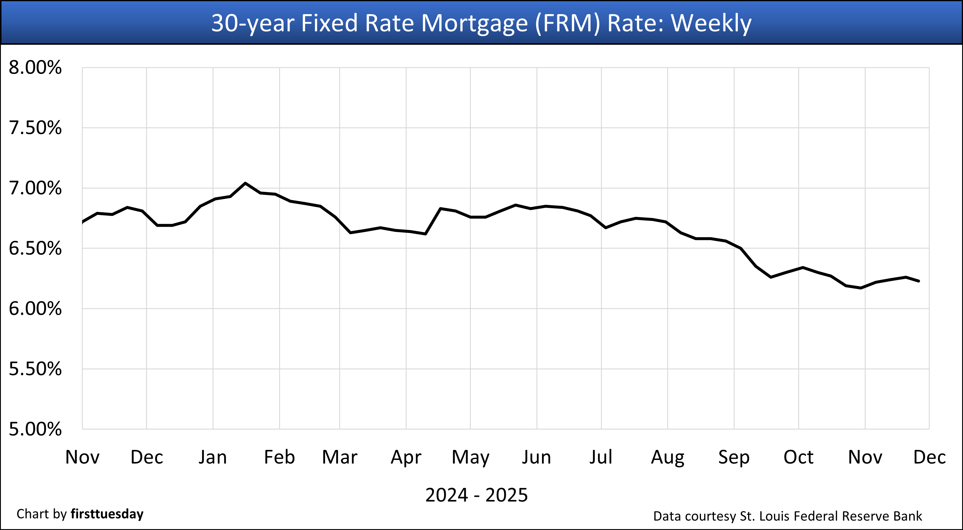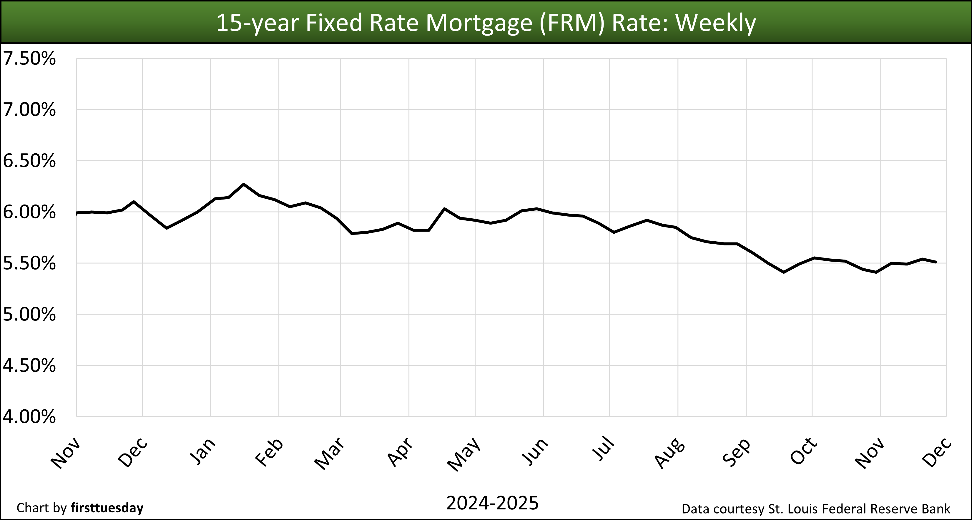 The rate on an average 30-year fixed rate mortgage (FRM) dipped slightly to 6.23% in the week ending November 28, 2025. The average 15-year FRM decreased to 5.51%. For those able to switch, the 15-year FRM is one-eighth less expensive than the 30-year FRM — though principal is more quickly amortized in larger monthly payments.