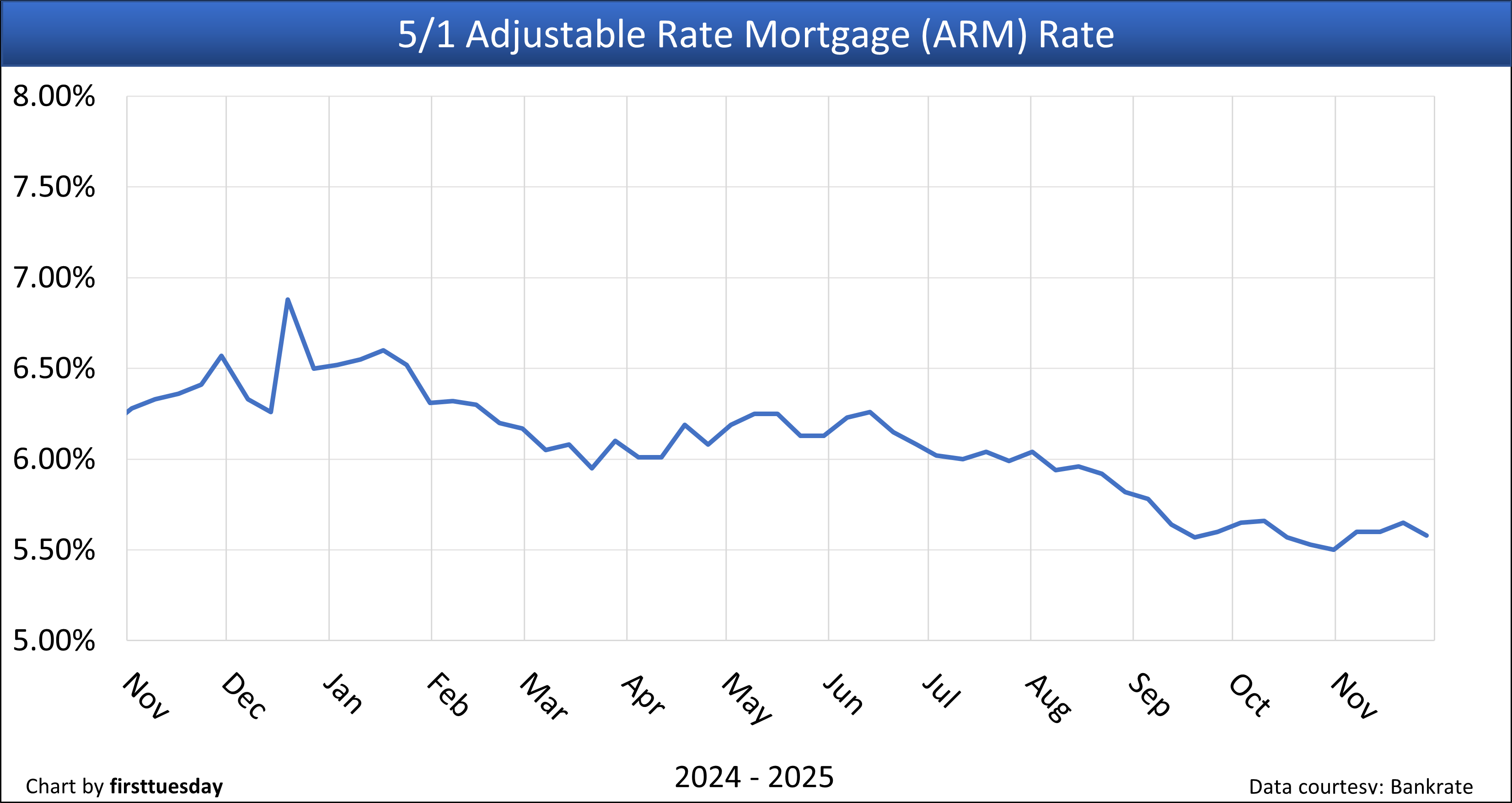 The average monthly rate on adjustable rate mortgages (ARMs) is less steady, slipping to 5.58% on November 28, 2025 after briefly spiking to 6.88% in December 2024 following a summerlong trough.