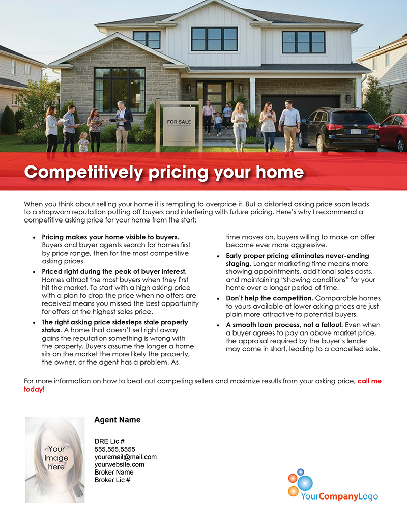 - Early proper pricing eliminates never-ending staging. Longer marketing time means more showing appointments, additional sales costs, and maintaining “showing conditions” for your home over a longer period of time.