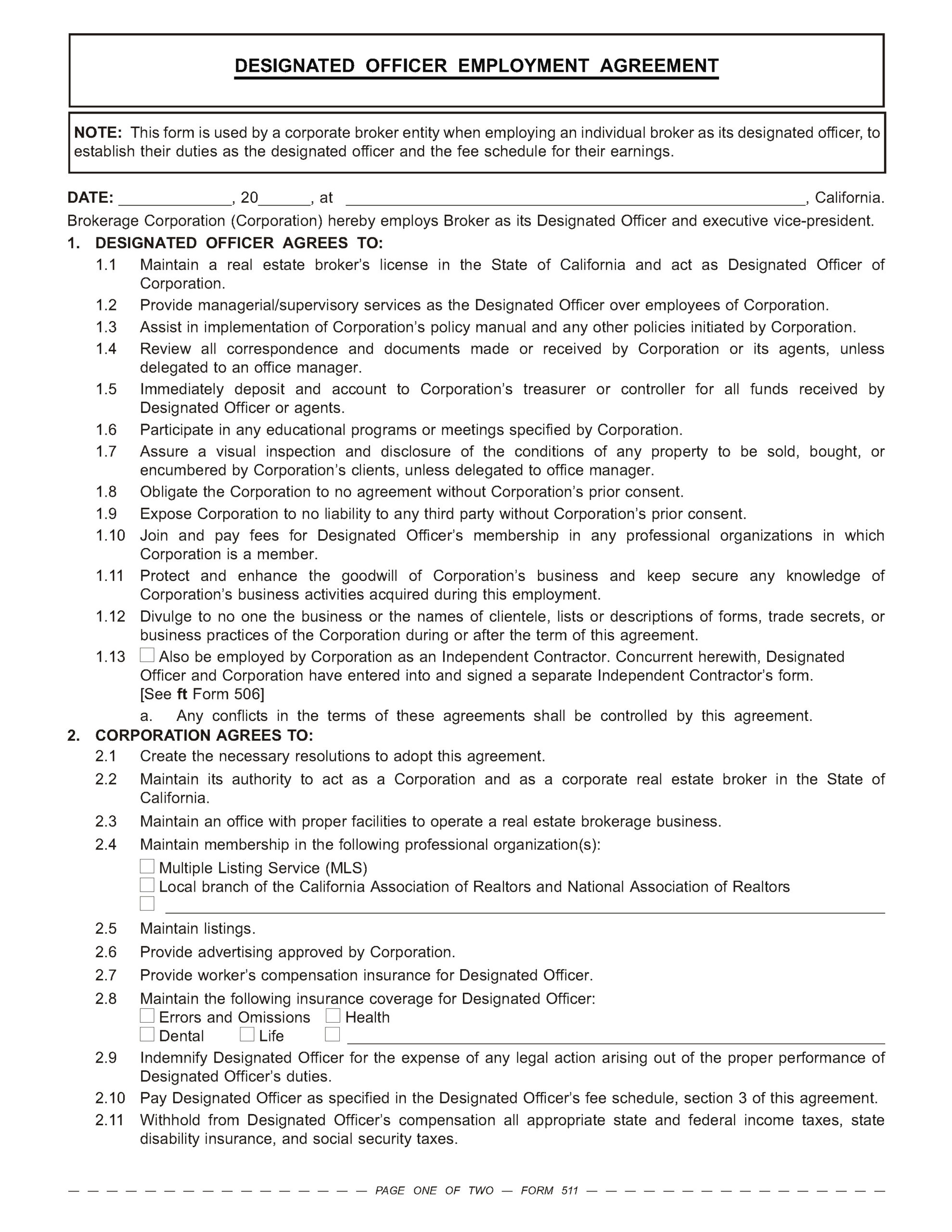 A corporation to be licensed as a broker uses the Designated Officer Employment Agreement published by Realty Publications, Inc. (RPI) when employing an individual broker as its designated officer (DO). The agreement establishes the DO’s duties as the designated officer and the fee schedule for their earnings. [See RPI Form 511]