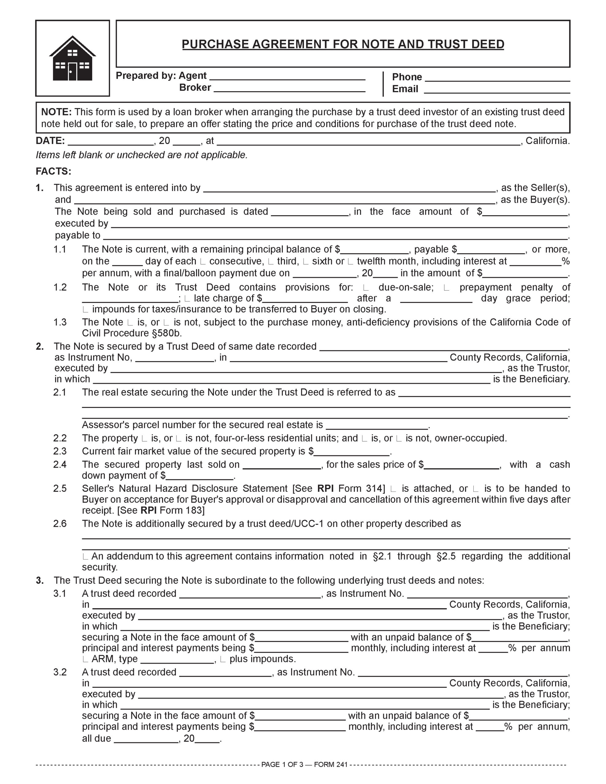 When arranging the purchase by a trust deed investor of an existing trust deed note held out for sale, a loan broker uses the Purchase Agreement for Note and Trust Deed published by RPI. The form allows the loan broker to prepare an offer stating the price and conditions for purchase of the trust deed note. [See RPI Form 241]