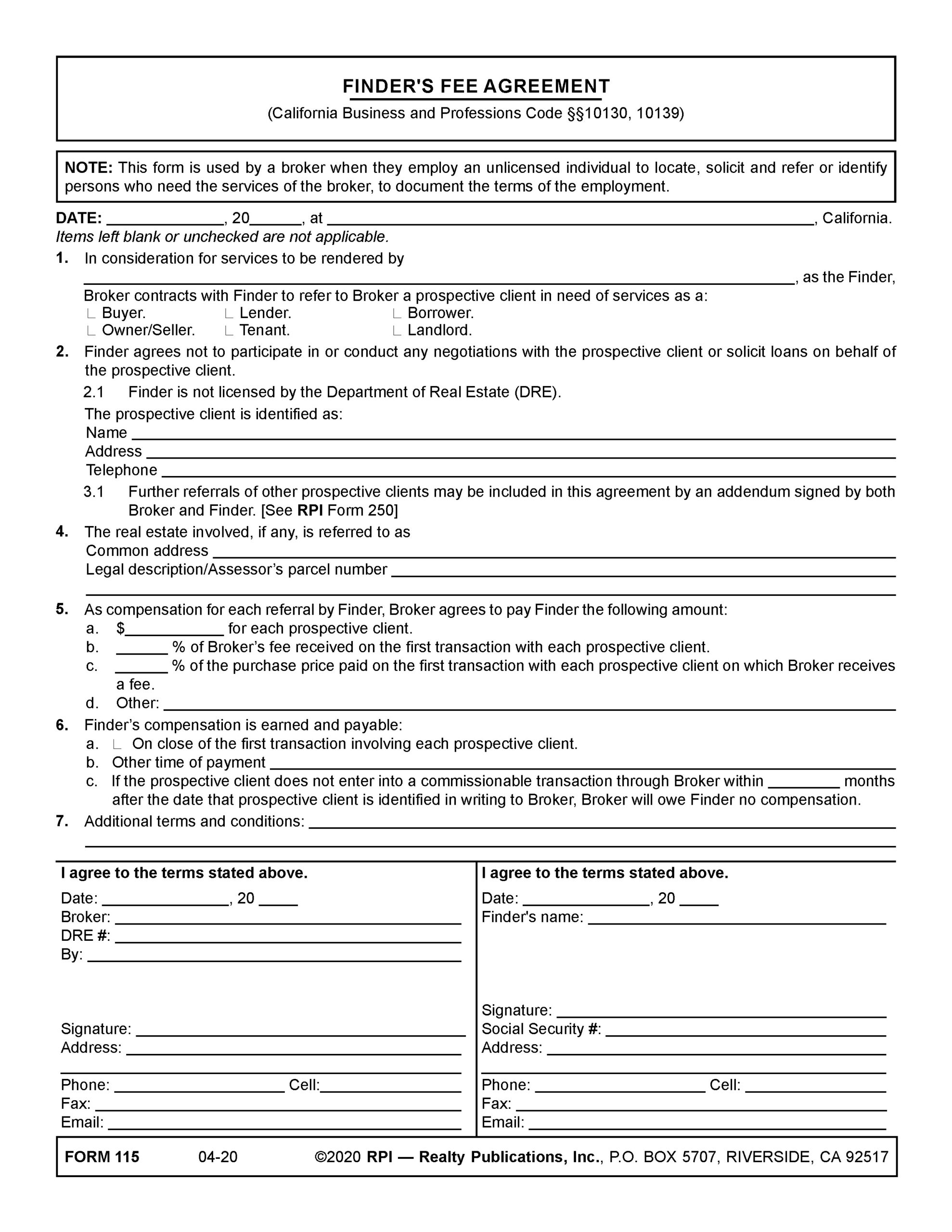 The Finder’s Fee Agreement published by RPI is used by an agent when they employ an individual to locate, solicit and refer or identify persons who need the services of the broker, to document the terms of the employment. [See RPI Form 115]