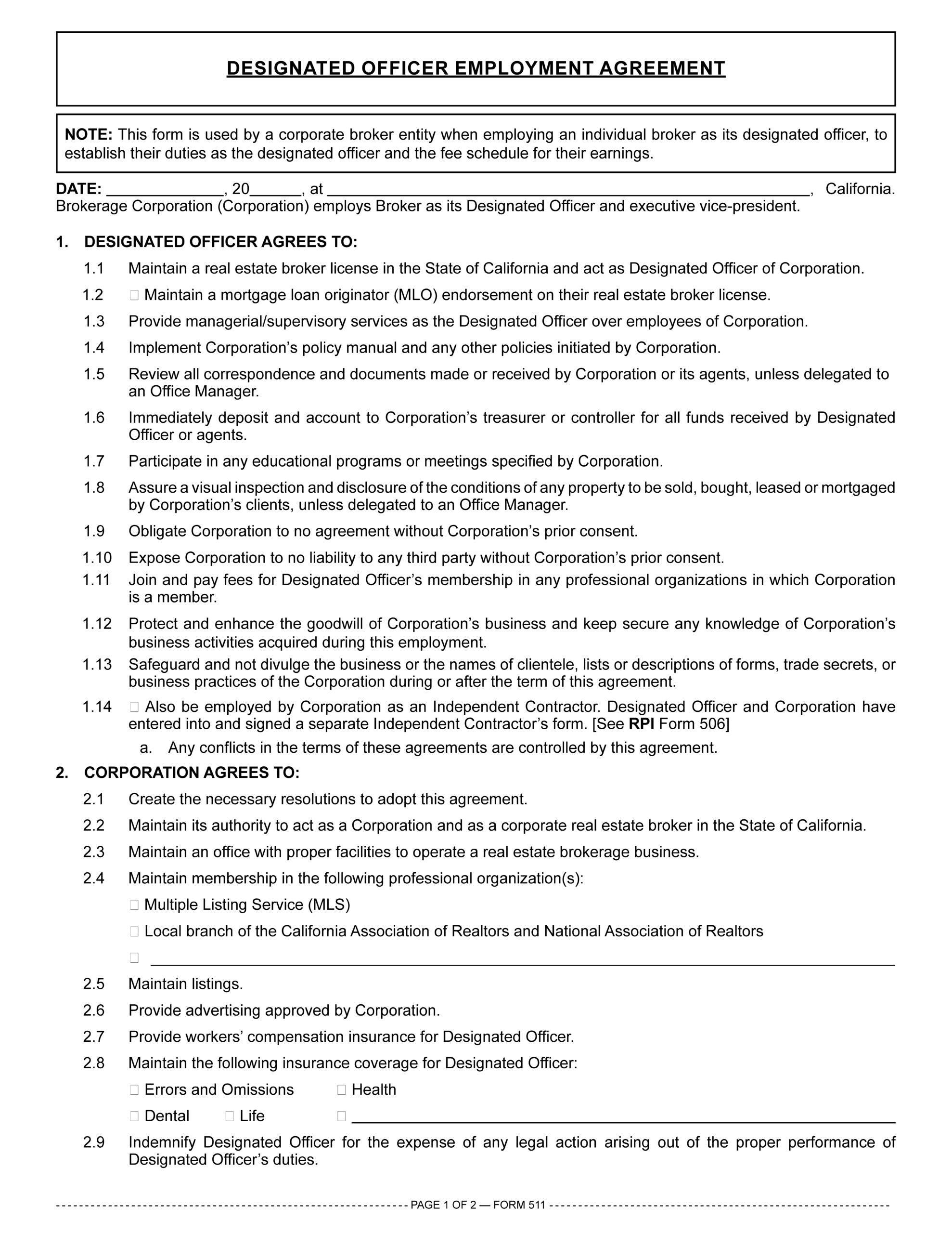 A corporation to be licensed as a broker uses the Designated Officer Employment Agreement published by Realty Publications, Inc. (RPI) when employing an individual broker as its designated officer (DO). The agreement establishes the DO’s duties as the designated officer and the fee schedule for their earnings. [See RPI Form 511]