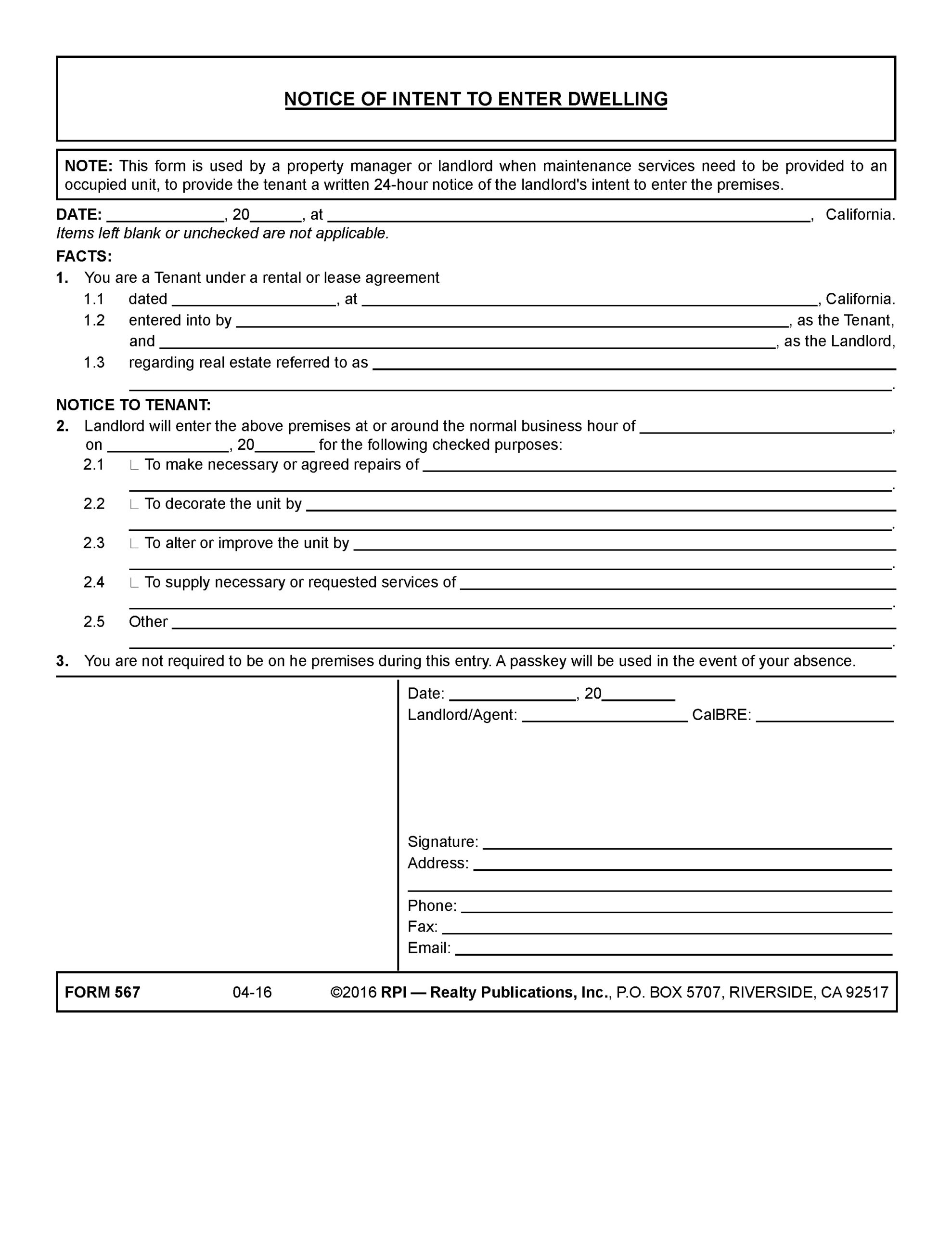 The Notice of Intent to Enter Dwelling published by RPI (Realty Publications, Inc.) is used by a property manager or landlord when maintenance services are needed to be performed on an occupied unit. [See RPI Form 567]