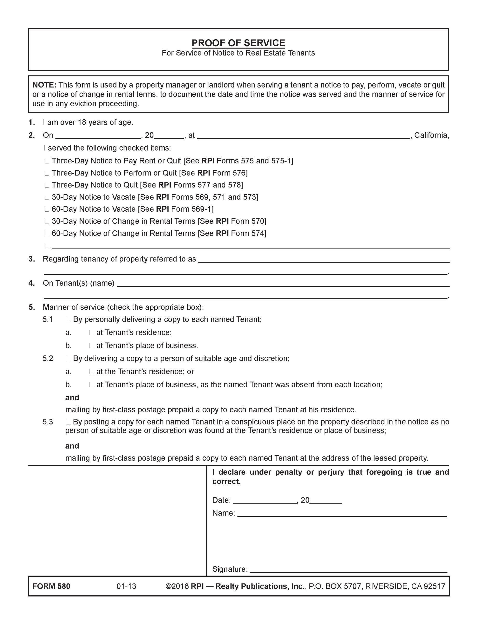 The Proof of Service – For Service of Notice to Real Estate Tenants published by RPI is used by a property manager or landlord when serving a tenant a notice to pay, perform, vacate or quit or a notice of change in rental terms, to document the date and time the notice was served and the manner of service for use in any judicial proceeding. [See RPI Form 580]