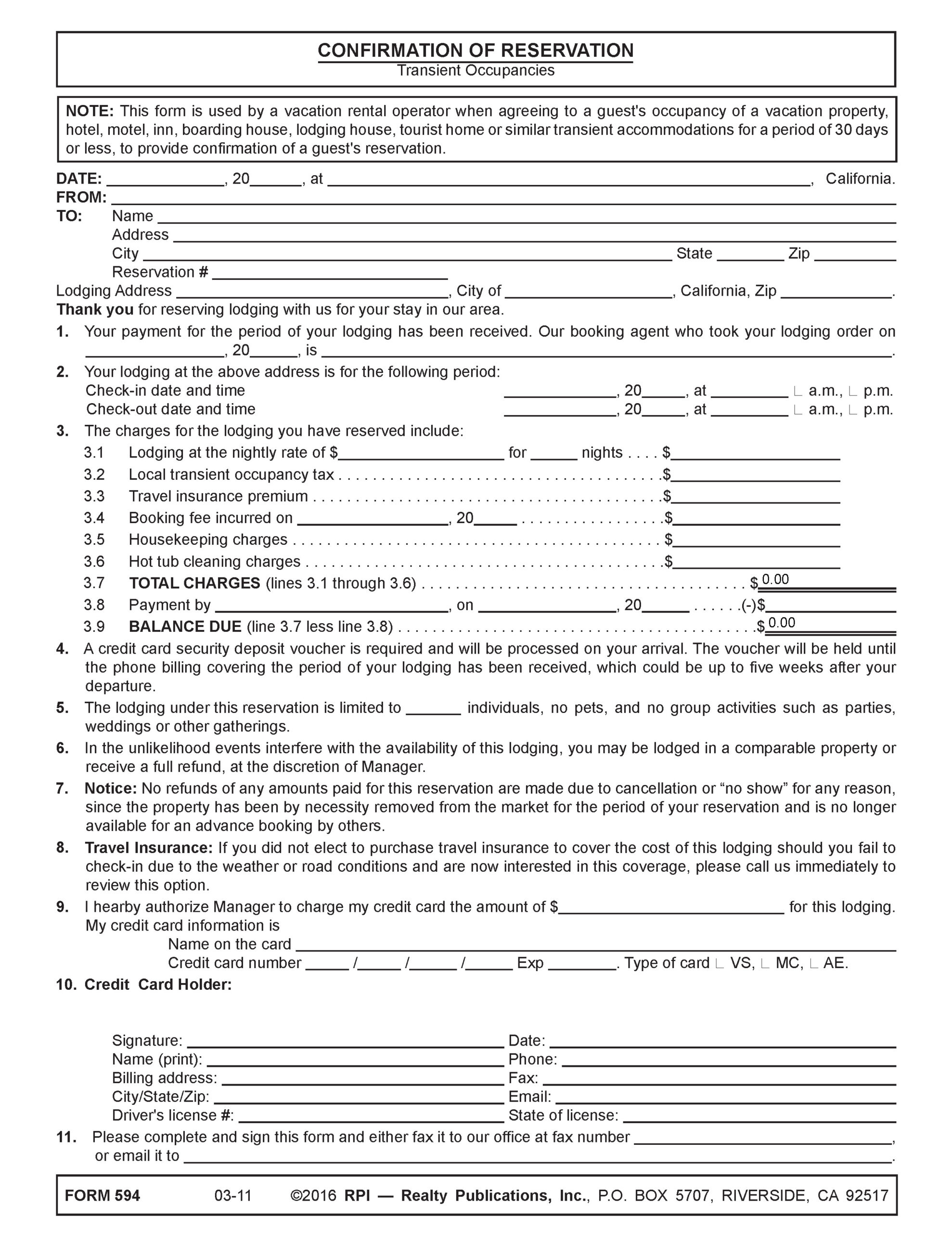 The Confirmation of Reservation – Transient Occupancies published by RPI is used by a vacation rental operator when agreeing to a guest’s occupancy of a transient accommodation for a period of 30 days or less, to provide confirmation of a guest’s reservation. [See RPI Form 594]