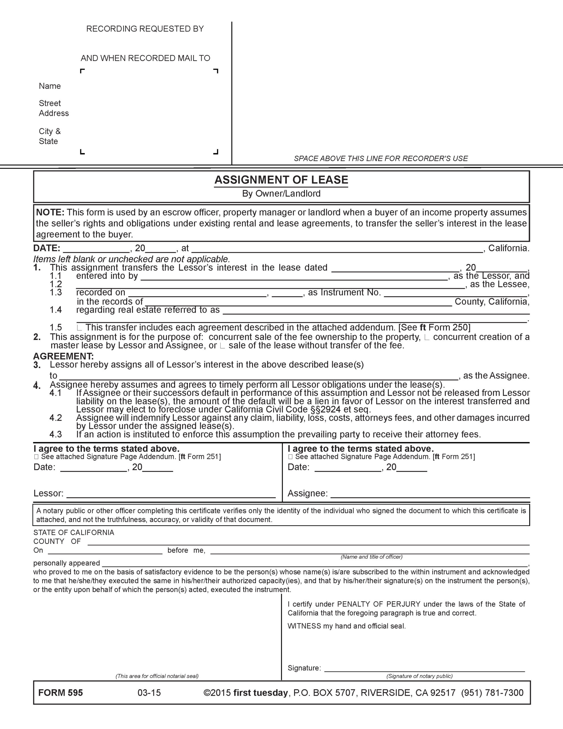 The Assignment of Lease – By Owner/Landlord published by RPI is used by a fee owner of income property, a broker or escrow when a buyer of the property assumes the owner’s rights and obligations under rental and lease agreements entered into with existing tenants, to transfer the owner’s interest in the lease agreements to the buyer. [See RPI Form 595]