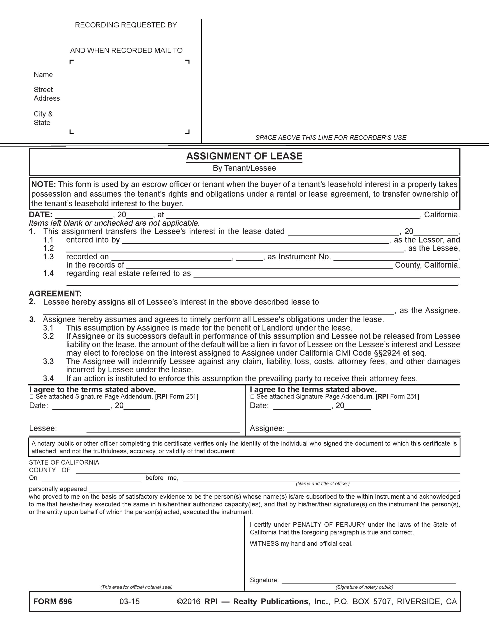 The Assignment of Lease – By Owner/Landlord published by RPI is used by a fee owner of income property, a broker or escrow when a buyer of the property assumes the owner’s rights and obligations under rental and lease agreements entered into with existing tenants, to transfer the owner’s interest in the lease agreements to the buyer. [See RPI Form 595]