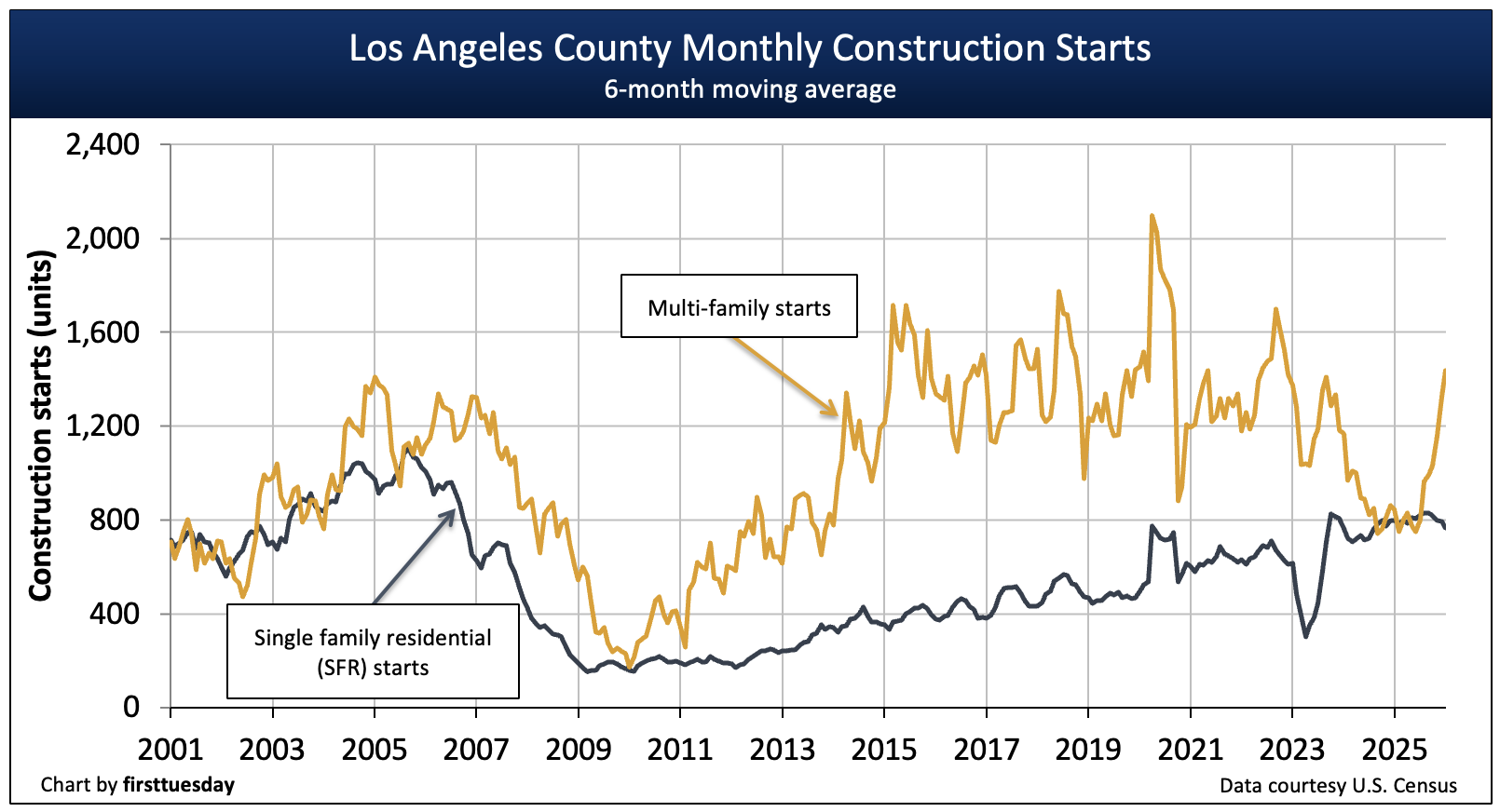 Single family residential (SFR) construction starts increased during 2025 in Los Angeles while multi-family construction starts plummeted. SFR starts increased 6% over the prior year while multi-family increased 19%. While SFR starts continue a long upward trend since bottoming in 2009, multi-family starts are more volatile, experiencing wide swings from month to month.
