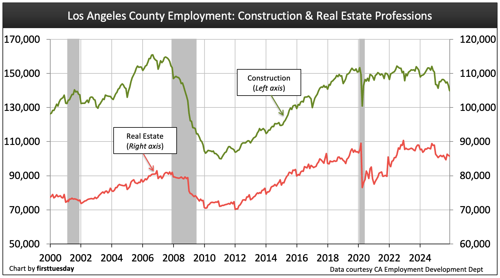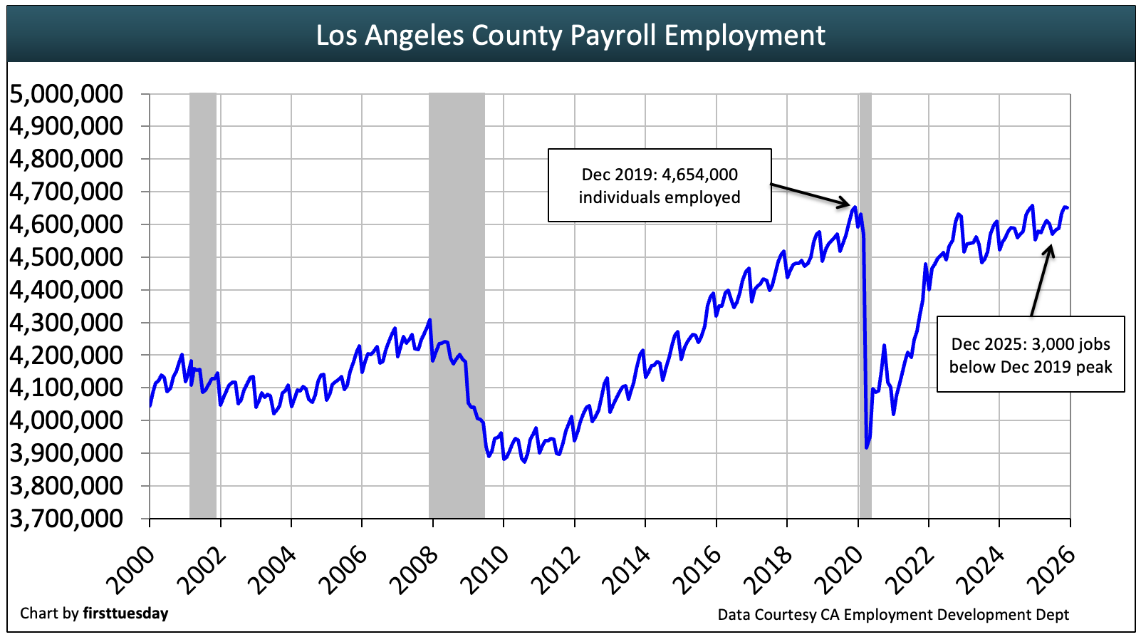 Since homeowners and renters require employment to make housing payments (with wealth exceptions), a growth in job numbers is key to a starts-and-sales housing recovery. Over 4.6 million people were employed in Los Angeles County at the end of 2025. This is very slightly lower than a year earlier, also just below LA’s December 2019 pre-recession/pandemic peak, with recovery progress continuing to wane monthly.