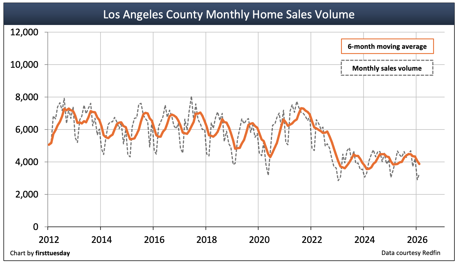 Year-to-date, sales volume in LA County is down 6% from 2025 as of February 2026.