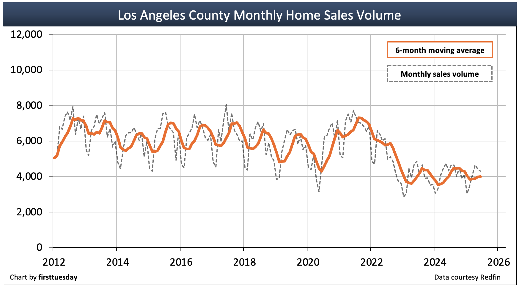 However, home sales volume for 2024 inched up 4.8% above 2023. Year-to-date, sales volume in LA County is roughly level with 2024 as of June 2025.
