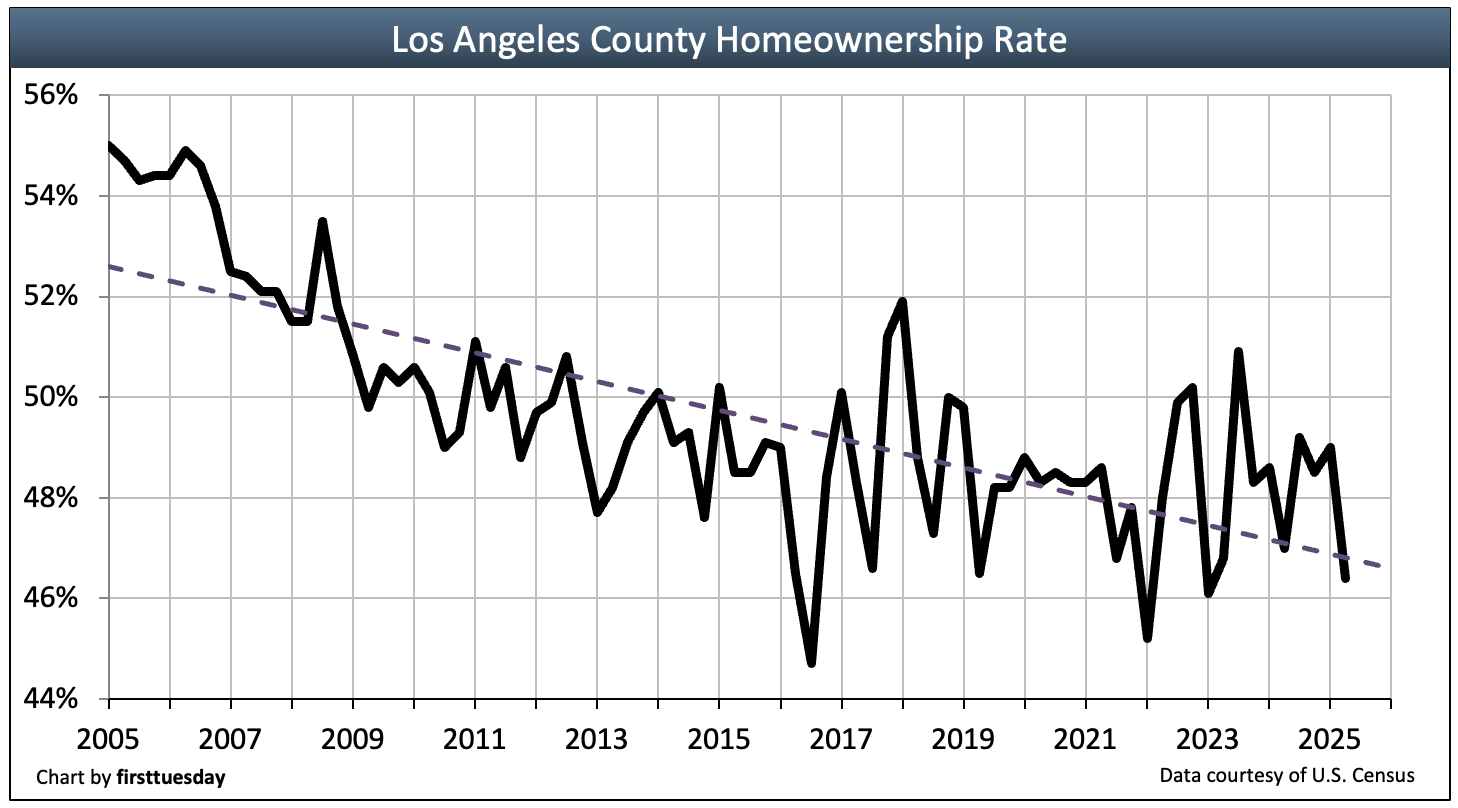 LA County’s homeownership rate has historically been lower than the state average, which was 55.3% in Q2 2025. LA County has a smaller share of homeowners since much of the county is urbanized. Renting is a convenience necessary for job mobility of the skilled and educated, if not a financial necessity. LA’s homeownership rate today is at what may be considered a “normal” (pre-Millennium Boom) rate, which was 48% in 2000.