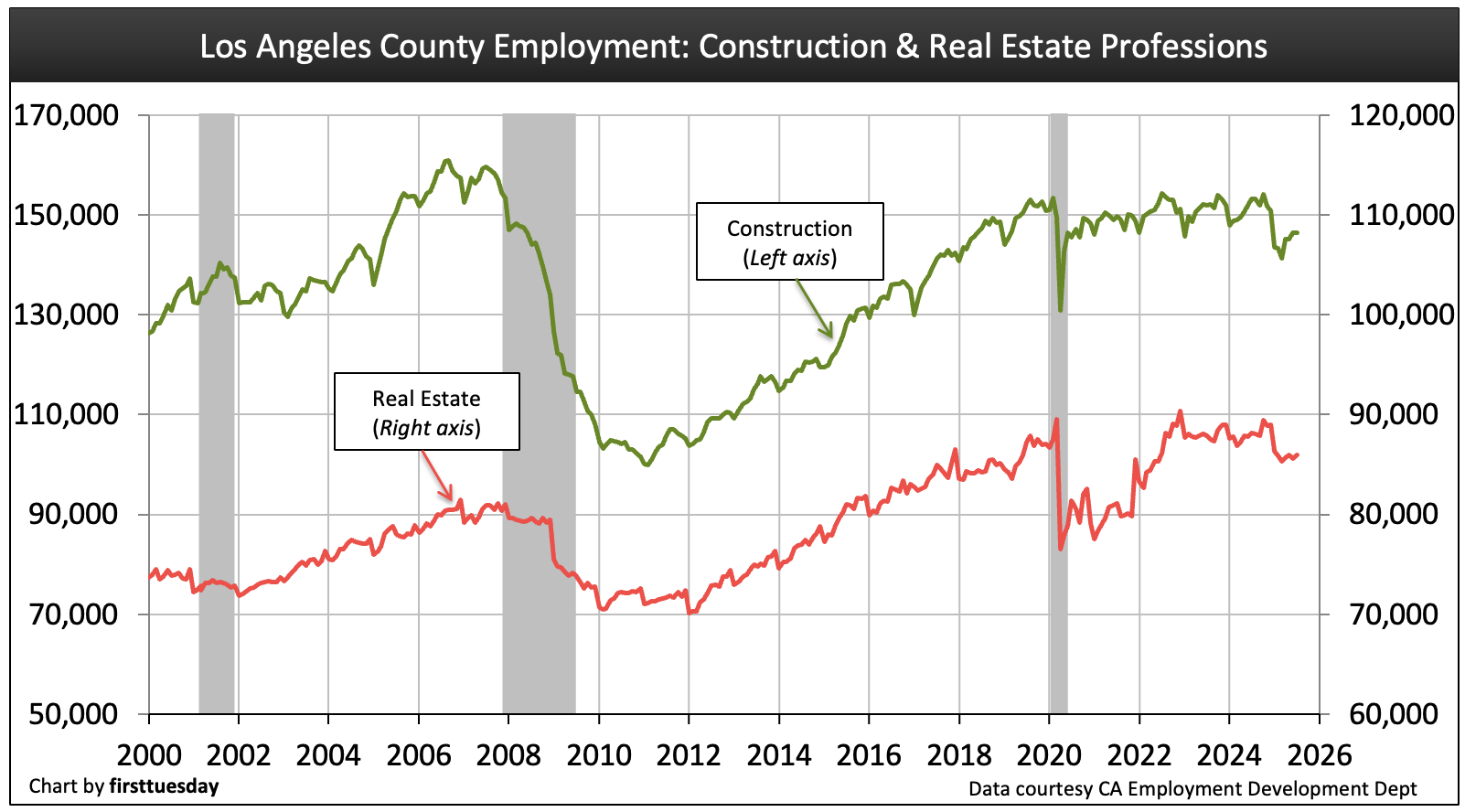 In the housing industry, construction jobs gradually regained numbers over the decade of recovery following the 2008 recession, reaching a full recovery just before the job losses of the 2020 recession. Likewise, the number of employed real estate professionals recovered gradually, cresting pre-2008 recession levels in 2016 and rising.