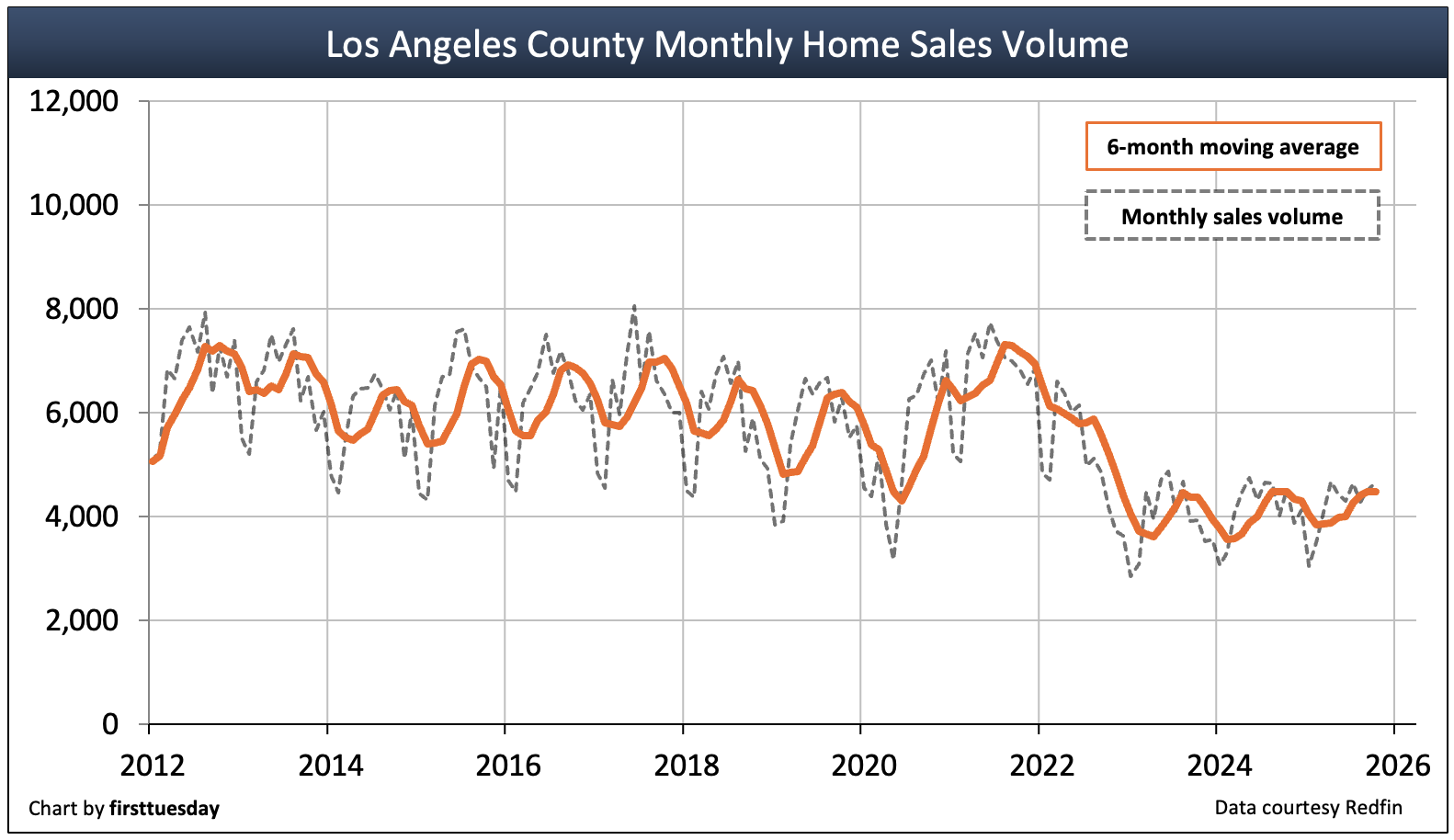 However, home sales volume for 2024 inched up 4.8% above 2023. Year-to-date, sales volume in LA County is roughly level with 2024 as of October 2025.