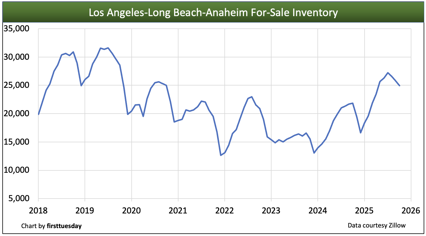 Inventory of homes available for sale has risen from the historic low reached at the end of 2021. After plateauing in 2023, for-sale inventory in the Los Angeles metro area for 2024 averaged an increase of 28% more properties over a year earlier — now another 14% higher as of October 2025. The winter months typically see the lowest inventory of homes for sale, peaking around mid-year.