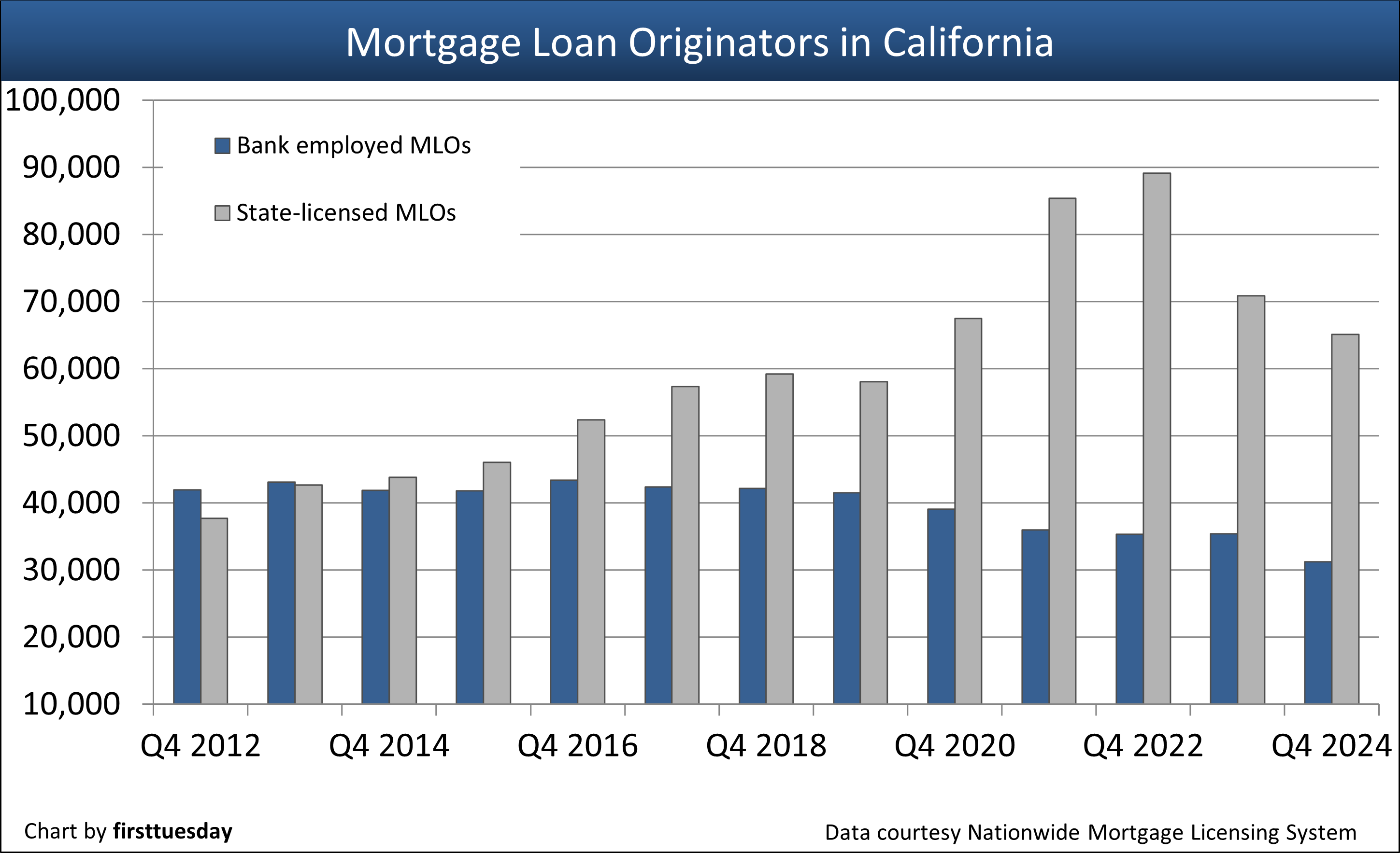 For depository institutions – banks – operating in California in December 2024, they employed 31,200 federally-registered mortgage loan originators (MLOs). Bank MLO employment is down 11.7% from a year earlier. A similar decline for state-licensed DRE and DPFI MLOs in California totaled 65,100 in December 2024, down 8.1% from a year earlier, the decline being solely with DFPI MLOs.