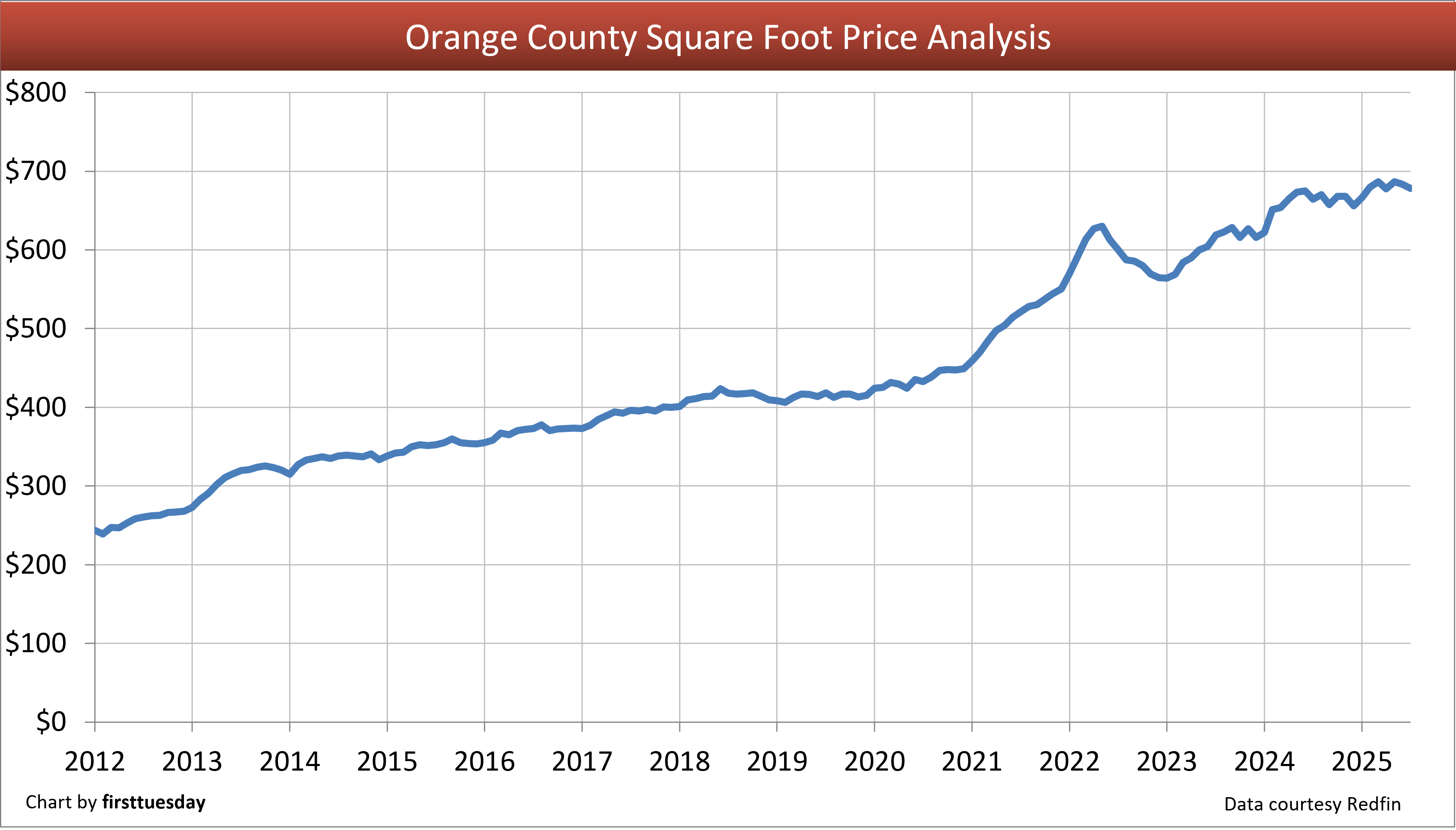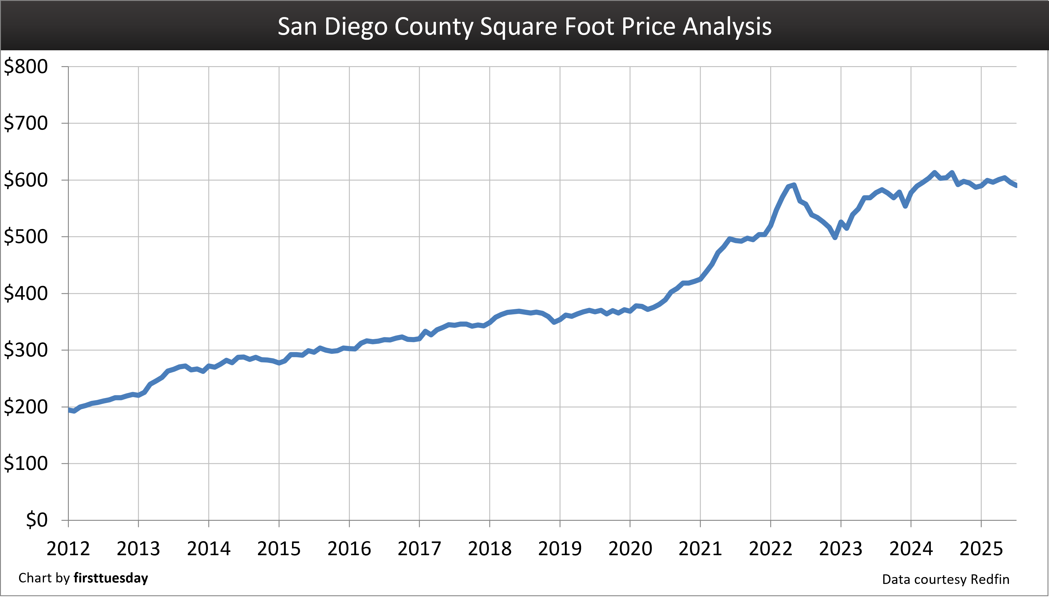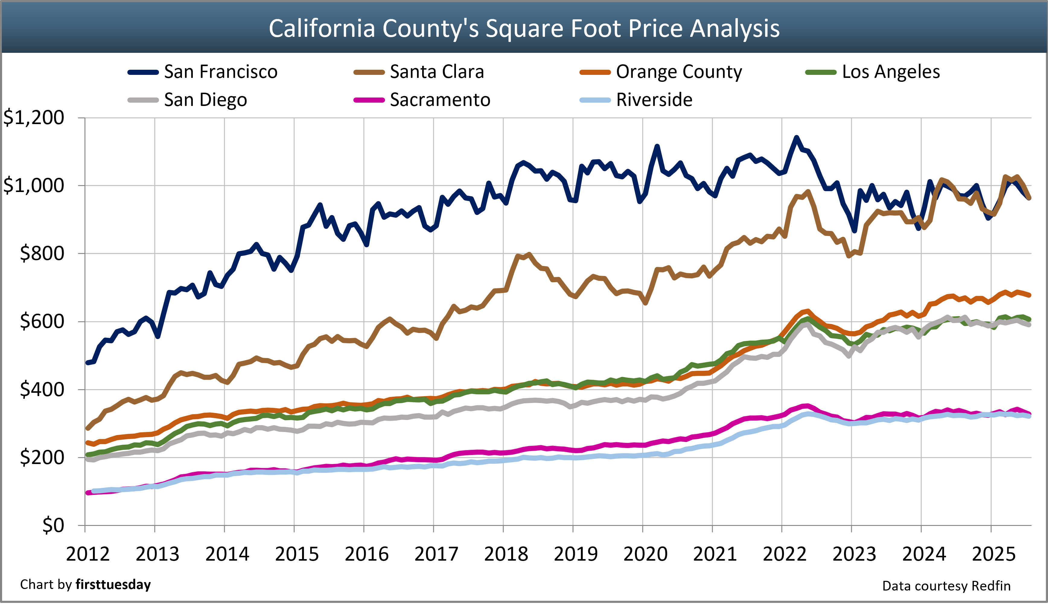 The month of July 2025, which ended the weakest annual spring buying phase in a decade, saw all seven major counties decrease their price per square foot. California as a whole slid to $507 per square foot, down 4% from the state’s most recent peak at the end of March 2025.