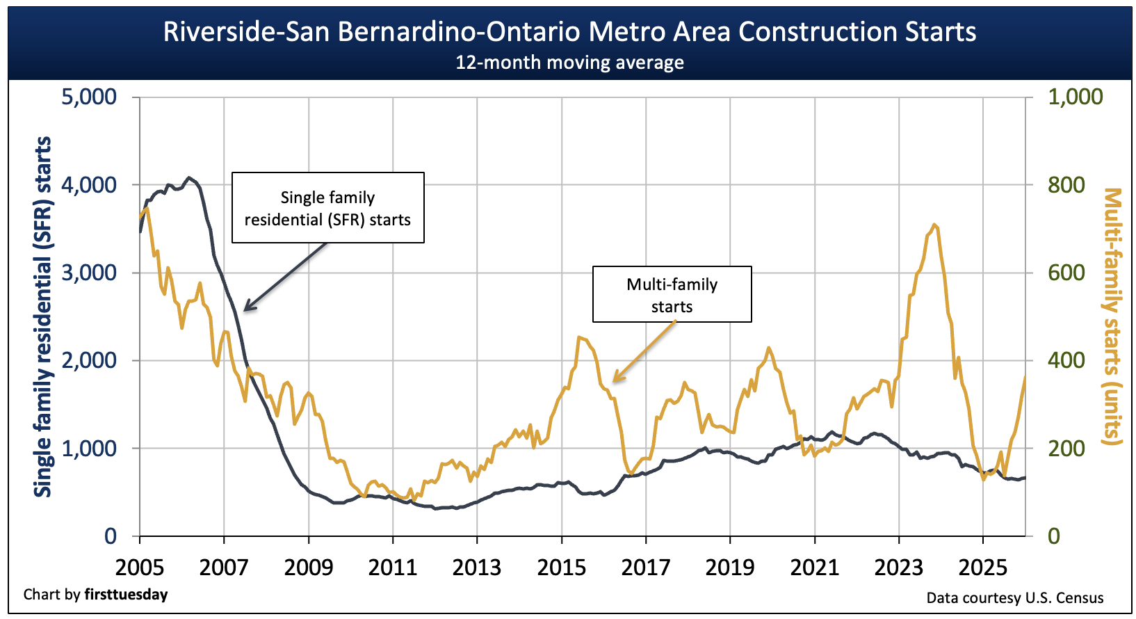 Multi-family starts number 2,800 units in 2025, a significant increase from the 1,500 units starts in the prior year. In Riverside County, the focus on multi-family construction is far less pronounced than in regions closer to the coast, as its lower land cost keeps the costs of SFRs within reach of more households.