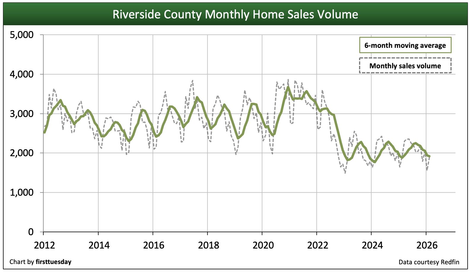 Today, sales volume is trending flat with a downward influence for 2026. Home sales volume in 2025 was roughly level with a year earlier. Worse, compared to the pre-pandemic peak of 2019, sales volume is 28% lower in Riverside.