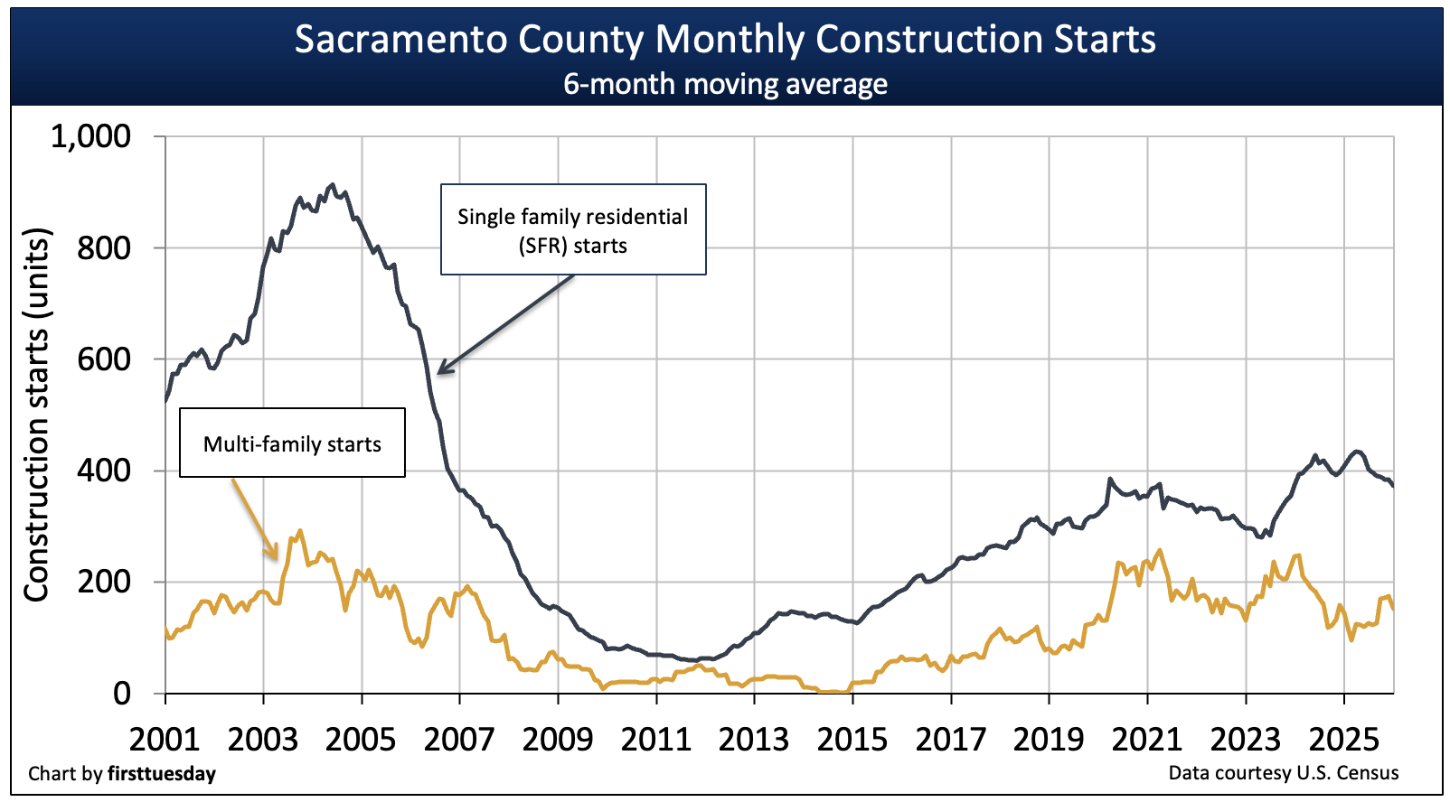Today’s level of construction is below what Sacramento needed to keep up with demand from homebuyers and renters alike. In fact, the peak year of 2003 saw two times more SFR construction starts than the 4,600 SFR starts experienced in 2025.