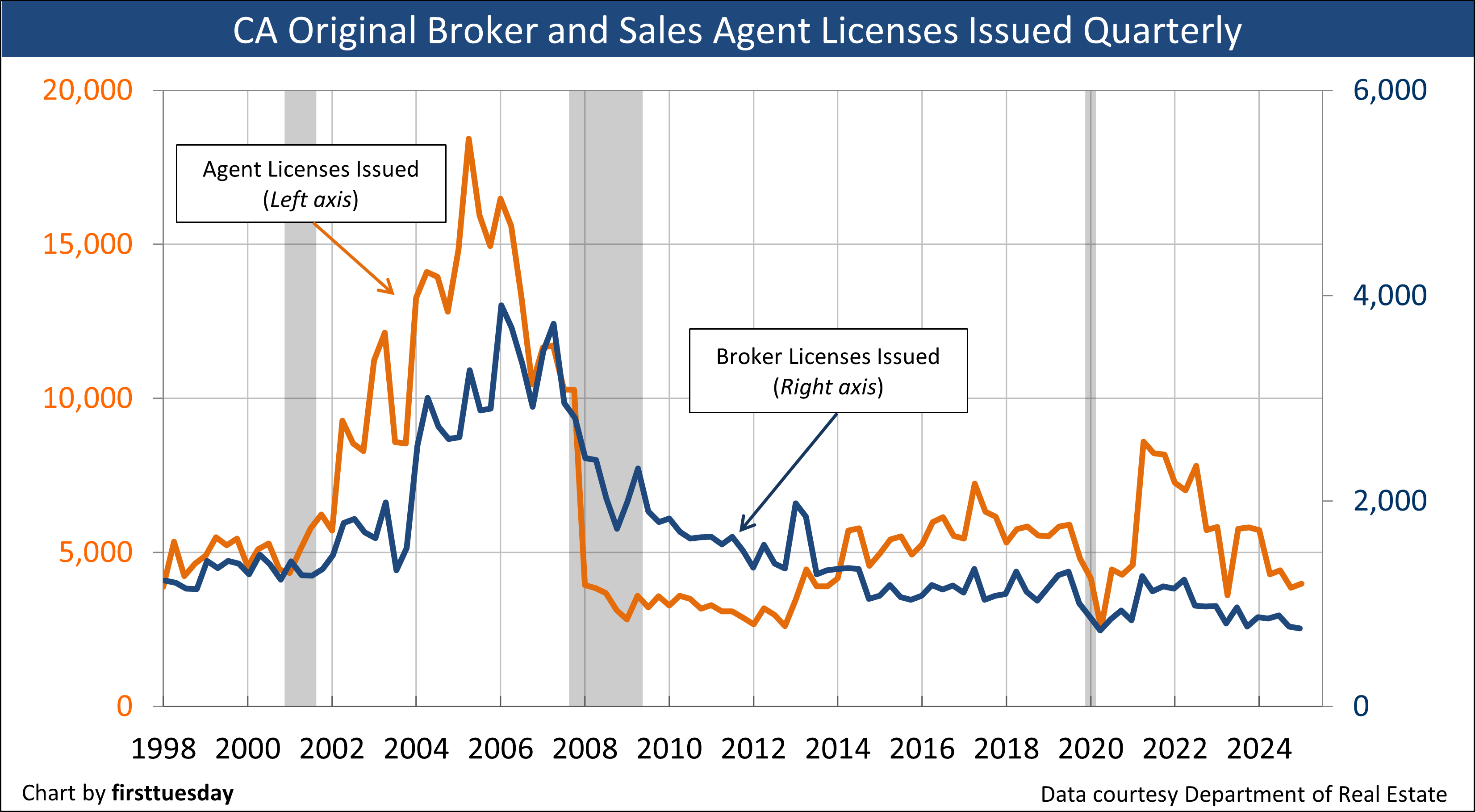 In the first quarter (Q1) of 2025, 4,000 new real estate agents and 760 new brokers received licenses from the California Department of Real Estate (DRE). Compared to one year earlier, newly-licensed agents declined 31% and newly-licensed individual brokers declined 12%.