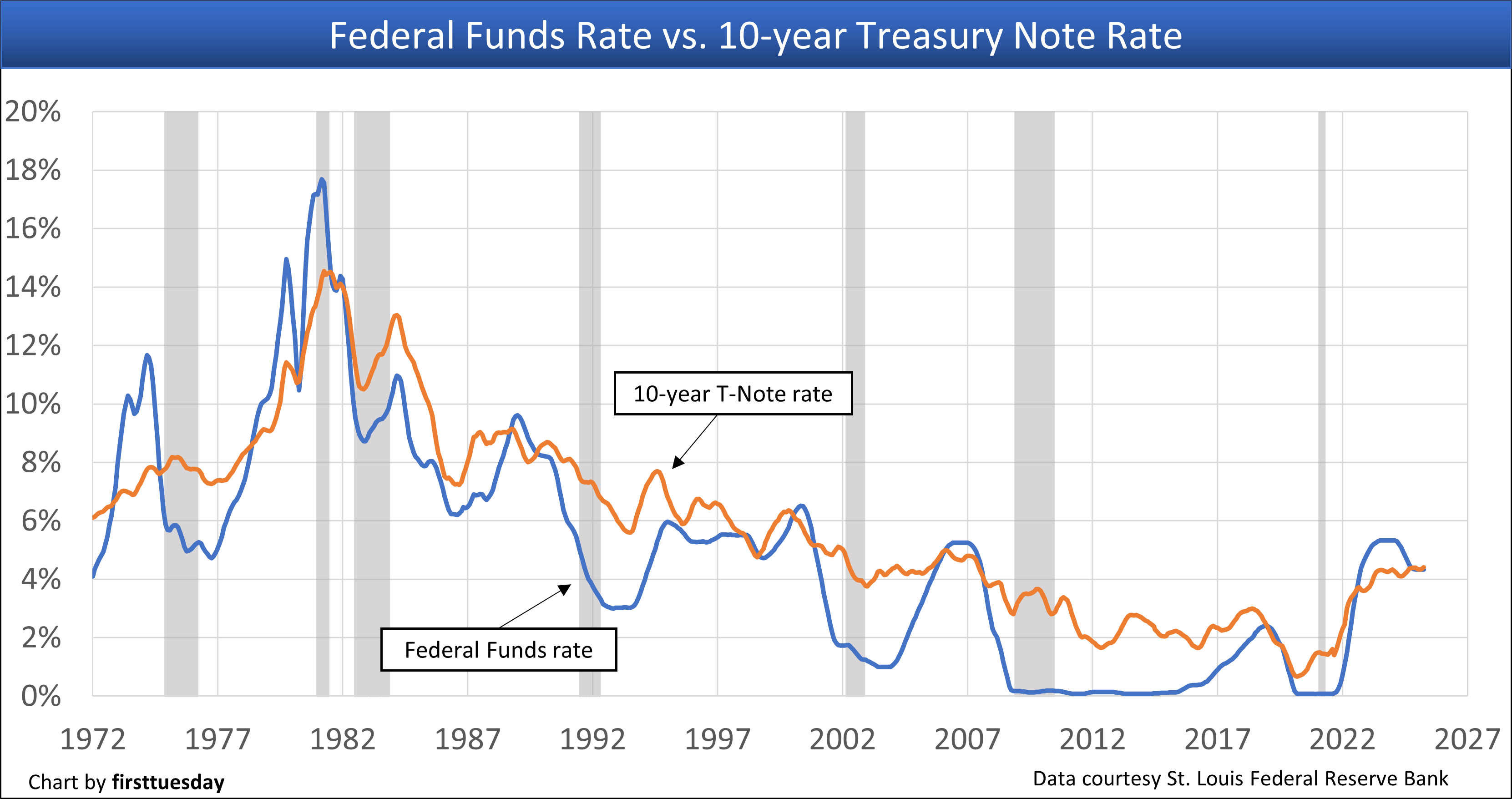 The setting of the FRM rate at origination, fixed for the life of the FRM, is tied to the 10-year Treasury note (10-year T-Note), not the Fed Fund rate. The 30-year FRM note rate in normal economic times was set prior to 2013 roughly at a 1.5% spread above the 10-year T-Note rate. This rate spread for consumer-purpose mortgages has varied up to 3% since 2013 and is around 2.25% going into the recession underway in 2025.