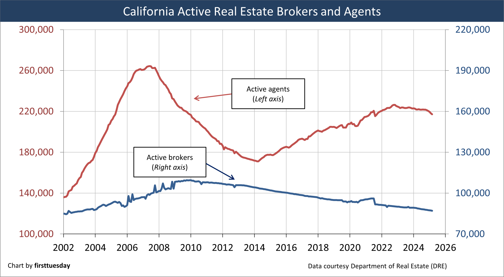 Conversely, the number of active sales agents steadily climbed from a 2014 low of 171,100 to a November 2022 peak of 226,300. As of March 2025, active agent numbers tapered to 217,400.