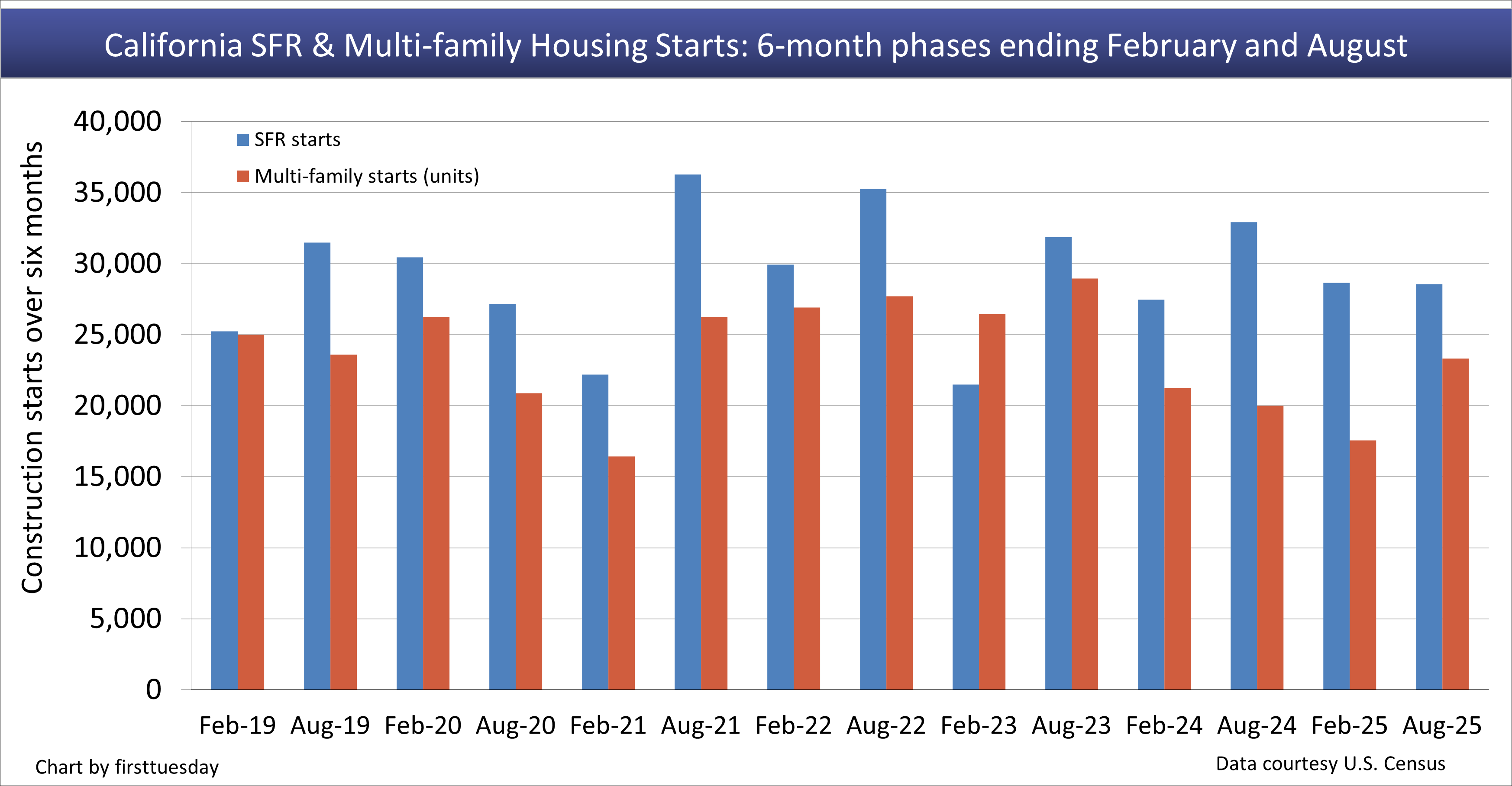 Single family residential (SFR) construction starts during the six-month phase ending August 2025 were 13.3% down from the same phase one year earlier. During the same six-month phase, multi–family construction starts were up 16.7% from a year earlier.