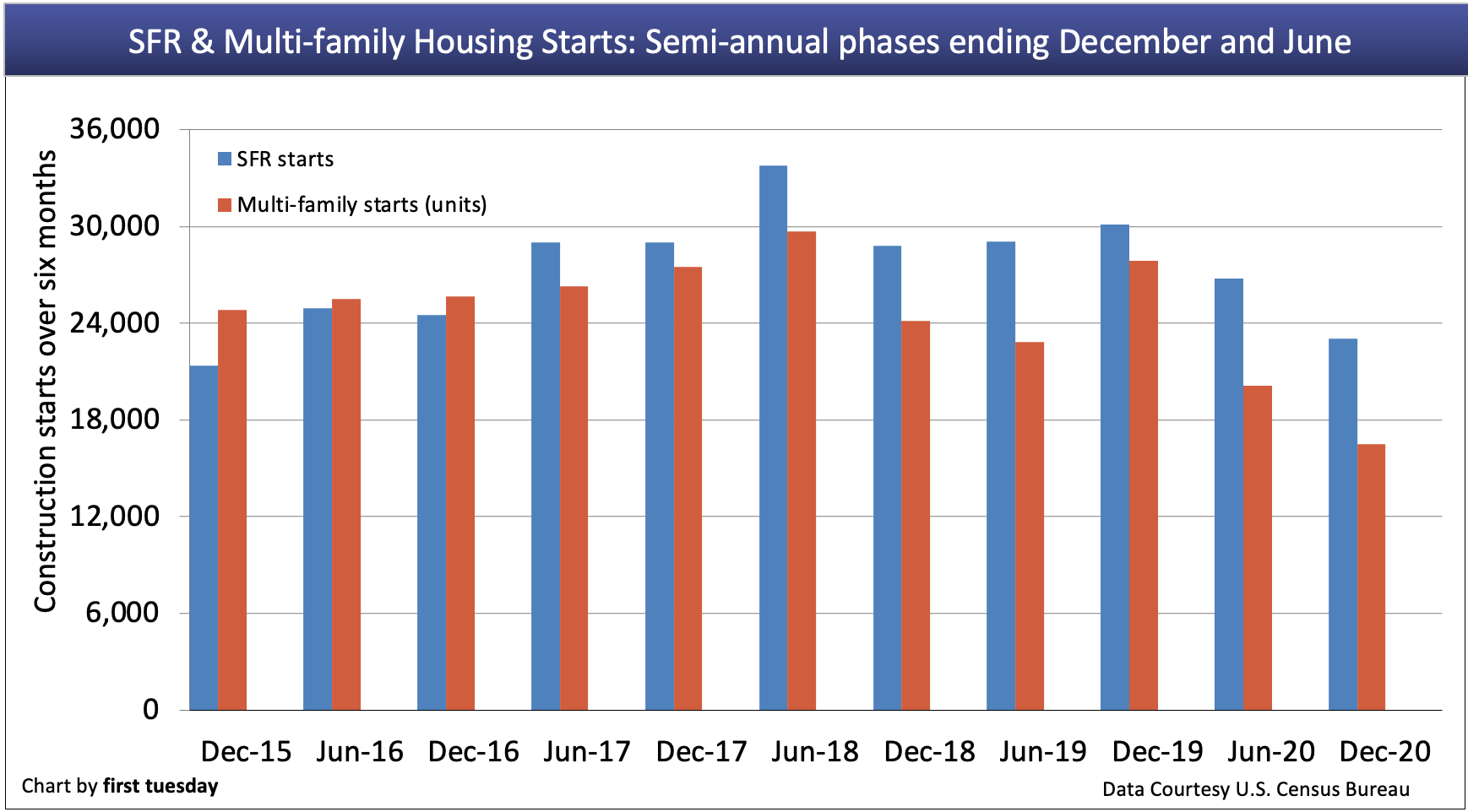 Single family residential (SFR) starts were 24% below one year earlier in the six-month phase ending December 2020. During those same six months, multi-family construction starts were down 41% from a year earlier, accelerating a downward trend that began in 2019.